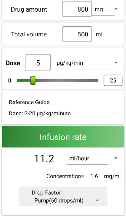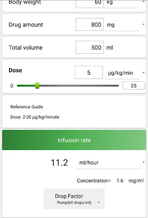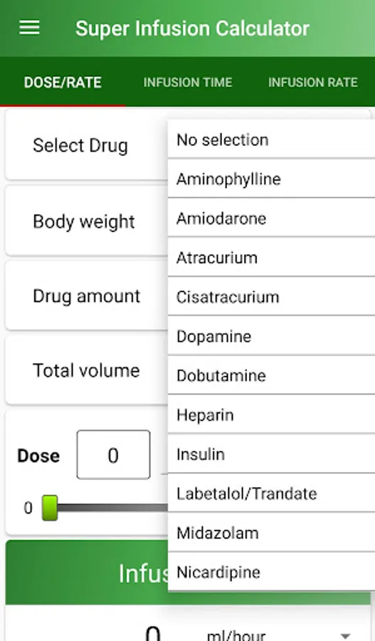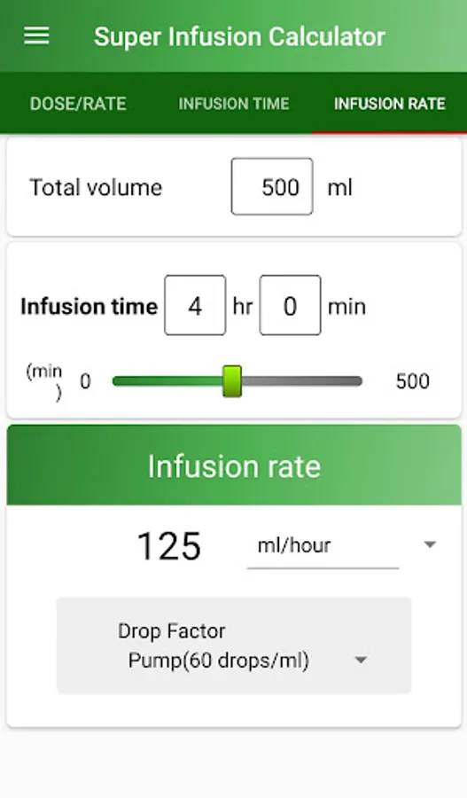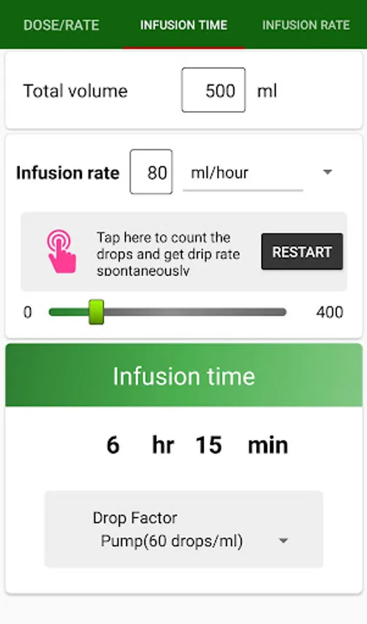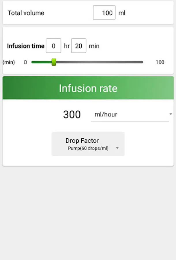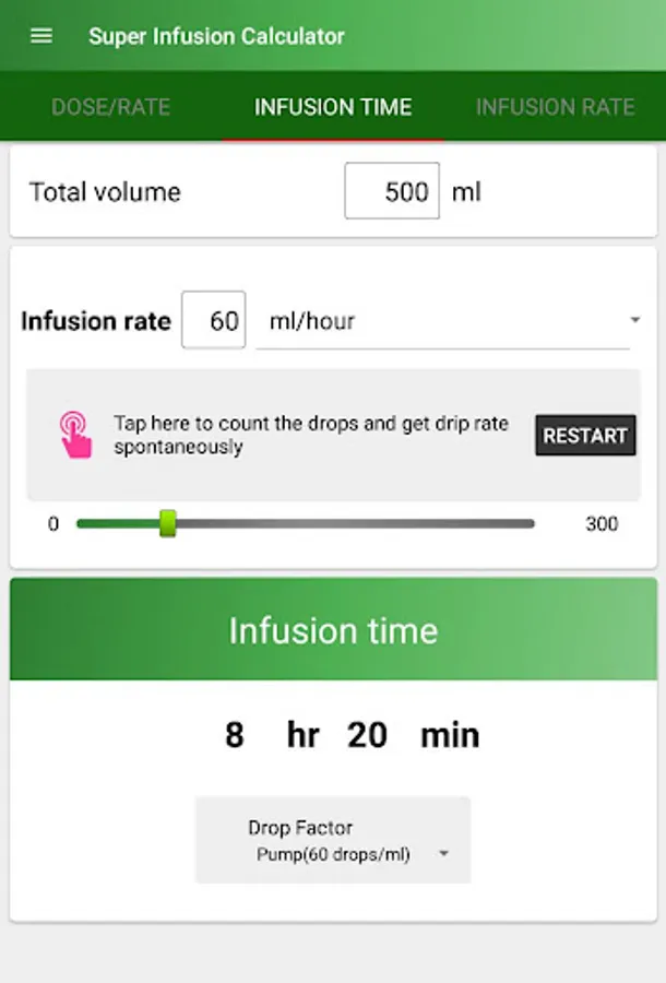 2. Infusion time calculator: get the infusion time from fluid volume and desired rate ; tap screen to get the drops and drip rate spontaneously.