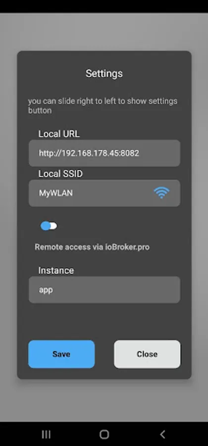 You can enter the URL of your local iobroker.material instance and open it easily with one click. Additionaly, you can add your iobroker.pro credentials and app will automatically switch between local or remote access depends on your WiFi network name (SSID).