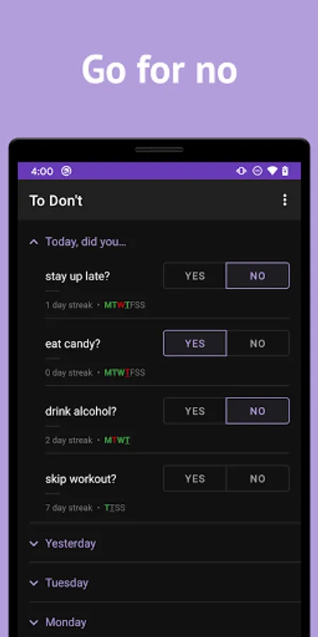 To Don't is a simple and straightforward tool to help break bad habits, stop addiction, or simply make small improvements to your life.