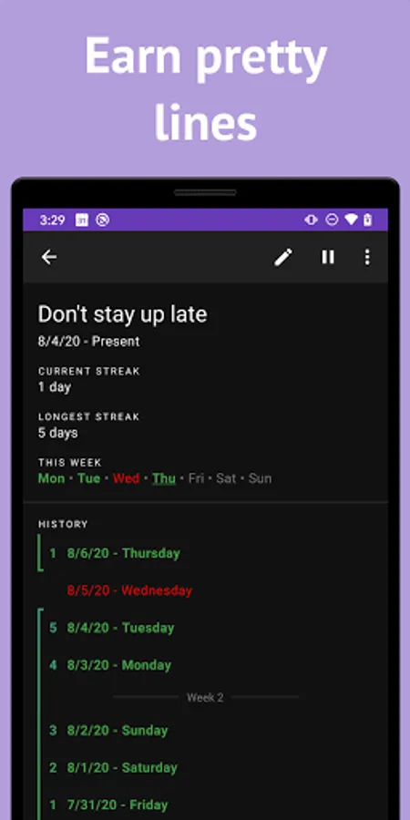 Answer daily questions to track your progress. Motivate yourself to break bad habits by building streaks over time. View your activity history to better understand your behavior.