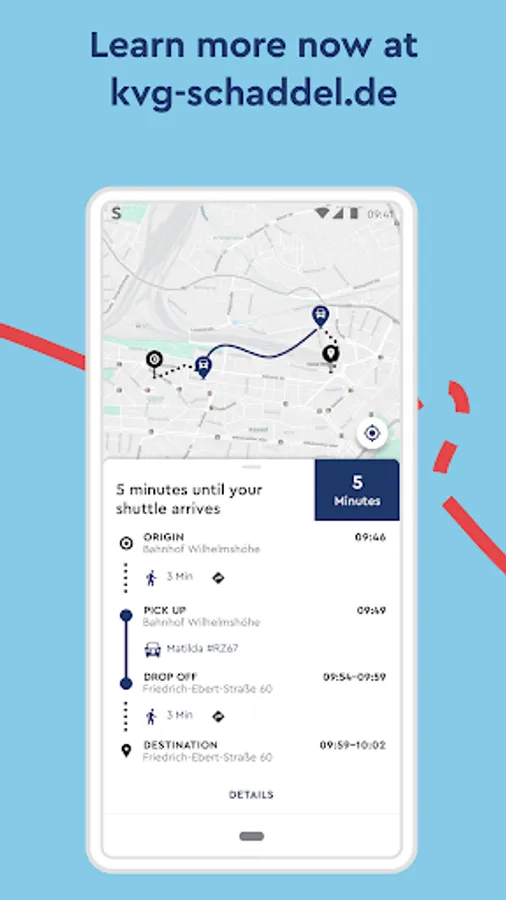 Schaddel is KVG's on-demand service and is now supplementing the bus and tram range with an attractive service late in the evening or at night for all Kassel residents and their guests. During the day, Schaddel in the Waldau industrial park and the Langes Feld industrial park ensures that all employees there, as well as companies and their customers, get the right offer. Fully electric, emission-free, digital and individually tailored to your needs. Rides with the Schaddel can be conveniently booked and paid for using the app. Schaddel brings its passengers flexibly directly to their destination or creates the connection to the next tram or bus stop. This makes using public transport even easier and more convenient. And this is how easy it works: Register once in the app and start driving straight away. Enter the start and destination address and the app will immediately show which vehicle will take over the journey, when it will arrive at the meeting point and how much the journey will cost. All you have to do now is book, pay automatically via the app and then you can start right away. Use the app's routing function to walk a few meters to the meeting point and track live in the app where the vehicle is at the moment and when it will arrive at the meeting point. After boarding, the Schaddel takes its passengers directly to their destination or to a virtual stop in the immediate vicinity of their destination. If bookings are received from other passengers en route who have a similar destination, these are combined into one trip. At the end of each ride, feedback can be given via the app.