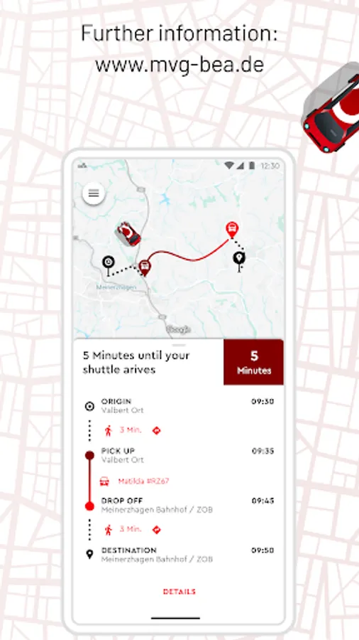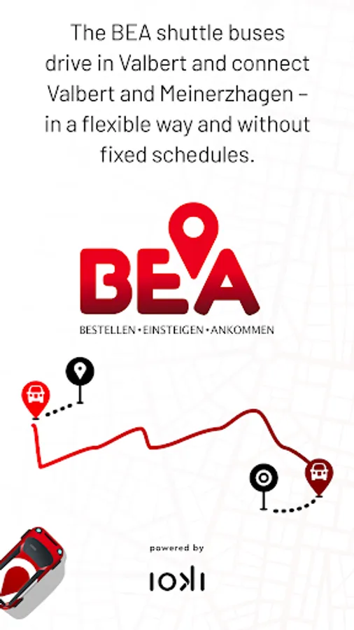 You can use BEA on working days between 5 am and midnight, and on Saturdays and Sundays between 7 am and midnight! The app shows you where your shuttle picks you up. You are not bound to the traditional stops, there are many additional virtual stops for getting on and off the shuttle. As long as you are waiting you can follow your shuttle virtually, seeing its current location and estimated time of arrival. After getting on the shuttle your BEA shuttle directly brings you to your chosen destination. In case other passengers book journeys with a similar destination, your requests are combined to one drive. After arrival you can provide feedback via the app.