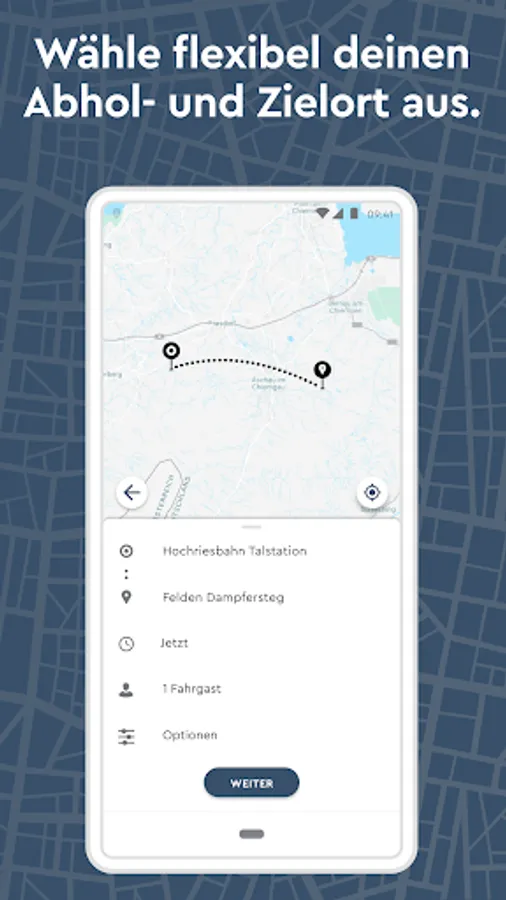 The amount of the fare depends on the zone. It starts with zone 1 (up to 4 km) for €2.50 and goes to zone 5 (from 15 km) for €6.00 (plus €1.10 per additional km). The app enables cashless payment by credit card. The fare can also be paid in cash when you board the bus. You determine your payment method when booking. The actual fare will be shown to you in advance.