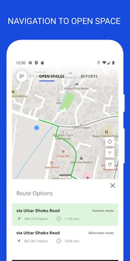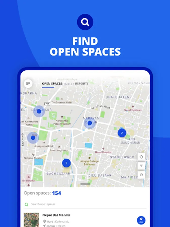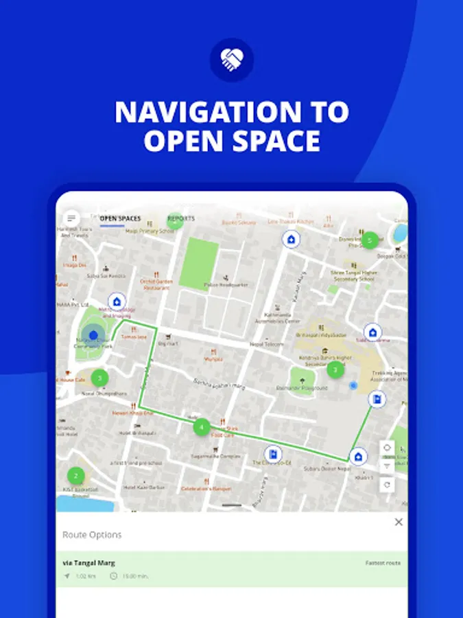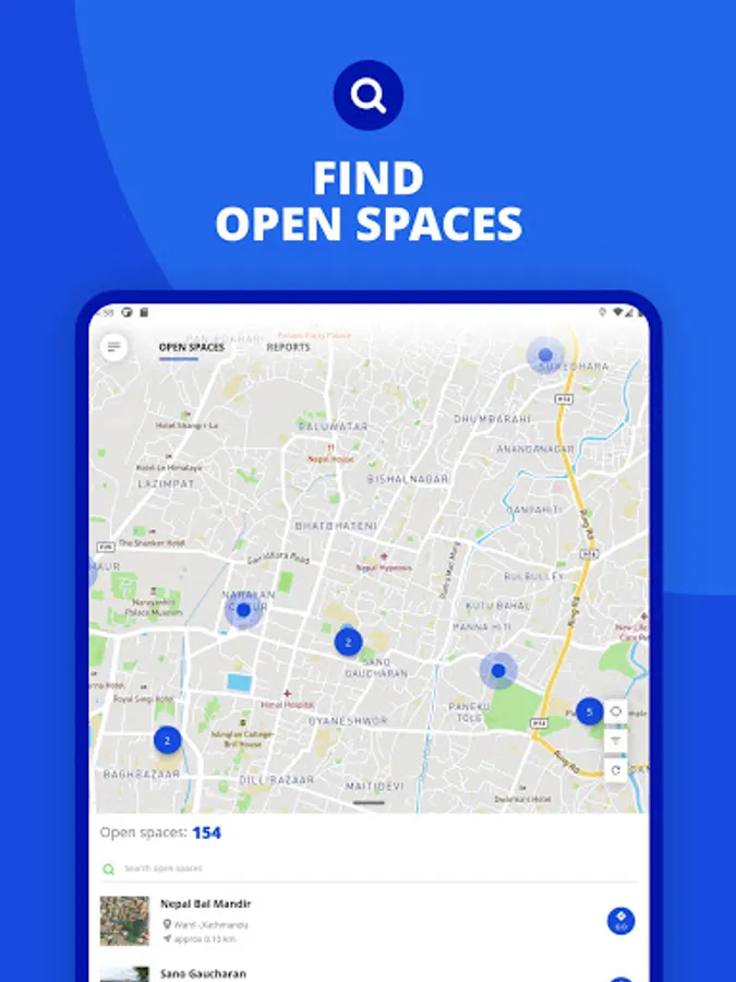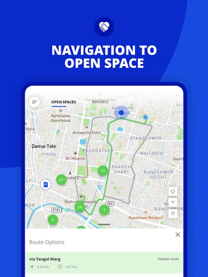 The Open Space Mobile Application is developed to provide the public with information regarding open spaces and the nearest critical facilities so that they can promptly use it during an emergency. The app contains location data of all identified open spaces in urban and rural municipalities of Province 3, 4 and 5. The mobile app users can navigate to each of these open spaces from their locations at the push of a button in the app. The app works both online and offline and can provide multiple routes from user locations to the nearest open space during an emergency. Besides, the mobile app also contains features such as reporting encroachment of open spaces (if any) with a photo or a text and resource publications relevant to open spaces. A humanitarian assistance tab is another important feature of this mobile app which is made functional only in the event of a disaster to notify the public on humanitarian activities such as emergency supplies or relief distribution in a location.
