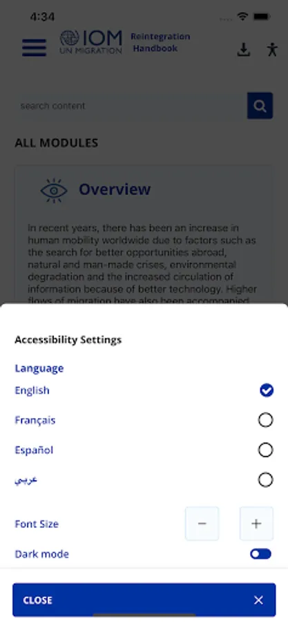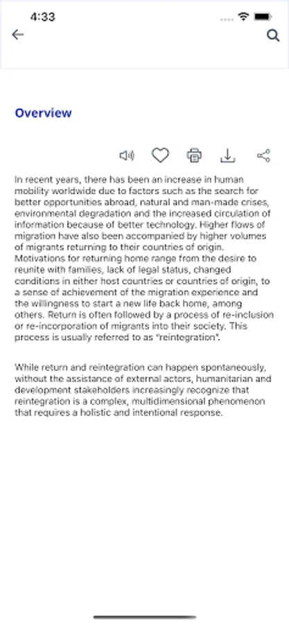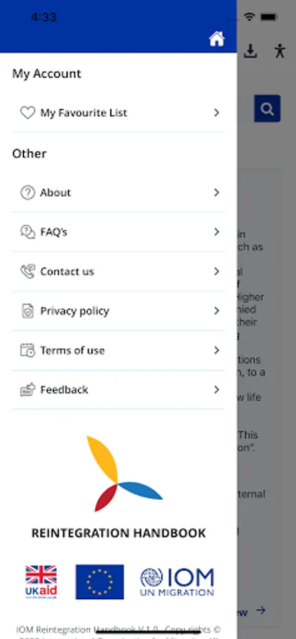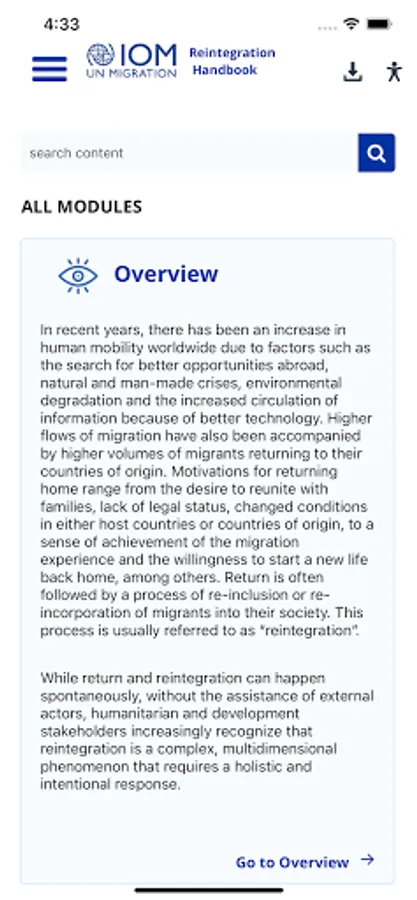 This app provides a user-friendly way to access IOM’s Reintegration Handbook. The publication was produced with financial support from the UK Department for International Development (DFID) as part of the project: Operationalizing an Integrated Approach to Reintegration (ORION), under the Safety, Support and Solutions in the Central Mediterranean Route programme. The Reintegration Handbook is intended as a guidance resource to be used flexibly, based on the specific implementation conditions of each context. It does not define standard operating procedures applicable to all contexts.
