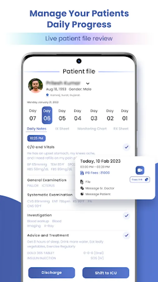 You can schedule appointments, conduct video consultations, and prescribe medications all from within the app. The app also has a section for managing inpatient care to view their medical history, and track their progress.
