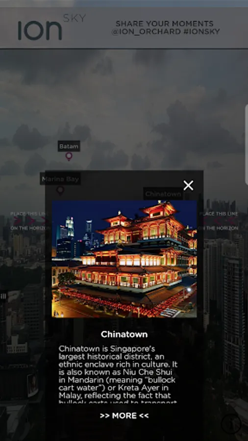 Our interactive augmented reality app will allow you to enjoy sweeping panoramic views while helping to identify the key attractions and areas visible from ION Sky. Have fun locating Singapore’s iconic landmarks from a bird's eye view and travel virtually around the country without leaving the comfort of ION Orchard. Get an insider's perspective with bite-sized nuggets of history and behind-the-scenes anecdotes that will enrich your understanding of Singapore's rich multicultural heritage.