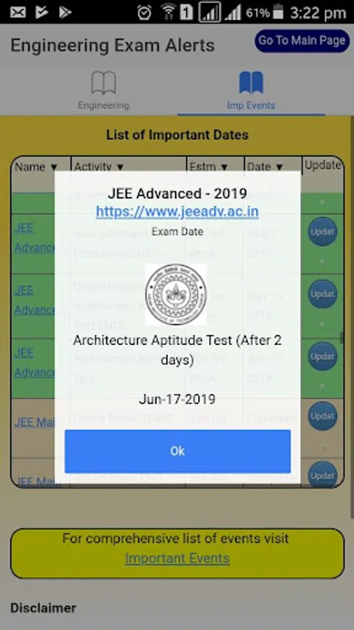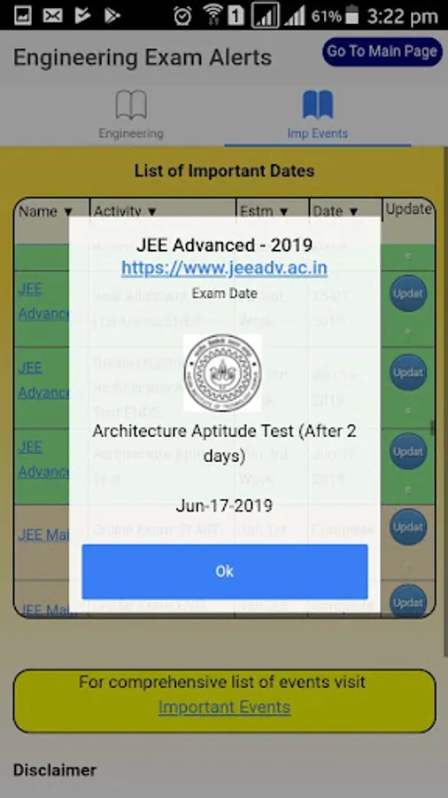 Engineering Exam Alerts app is a very useful tool to remind oneself about the upcoming exams related events. The app gives alerts about the important events (like registration date, last date to pay fees, admit card download date etc.) related to major research and engineering competitive exams conducted in India for class XII students well in advance. Specifically, the app gives notification alerts 10 days before, 3 days before and on the day of the event, so that the users are reminded in advance and get enough time to prepare for the events.