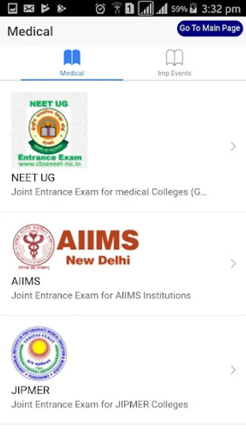 The 'Medical Exam Alerts' app also provides official links of the exams that contains detailed information about the exams which can be navigated through the app. These are a large number of competitive exams in India. The app contains information about the following exams: