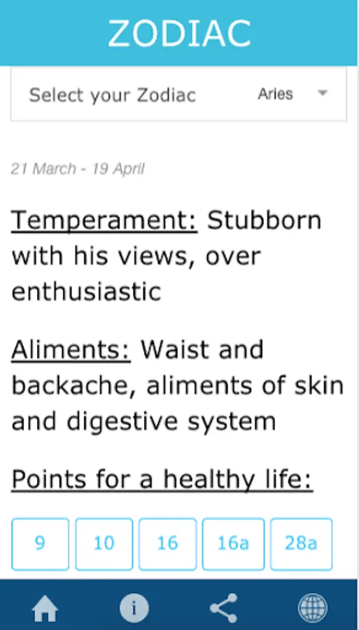 According to the science of Astrology, individuals of specific zodiac sign are likely to suffer from specific ailments. Using this application you can select your zodiac and get the common ailments for the same. Also, it will list the points to be pressed to minimise the effect of such ailments.