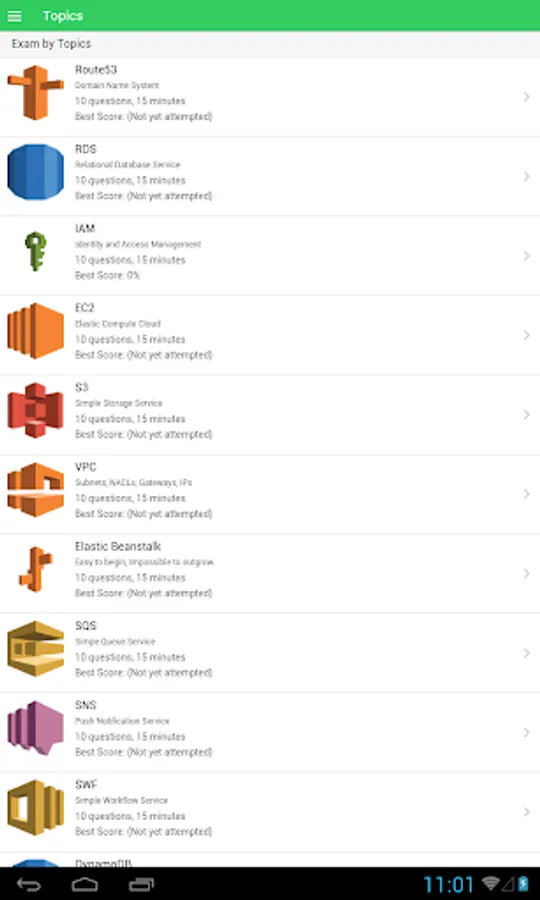 Topics covered: Route53, RDS, EC2, S3, DynamoDB, MFA, Multi Factor Authentication, SNS, SQS, SWF, CloudFormation, ElasticBeanstalk, IAM, VPC, EBS, CloudTrail, Cloud Front, Auto scaling, Load balancing, EBS, AWS console among others.