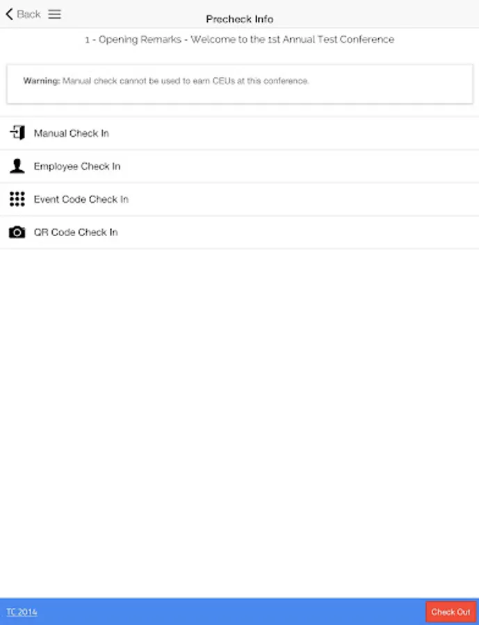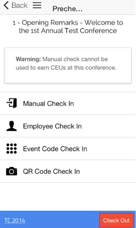 If you are a conference employee or volunteer (as assigned by the conference administrators), you will have an extra check in and out option called "Attendee Badge Check In." You can use that option to scan attendee badges they present on their phones instead of manually typing in user account information.