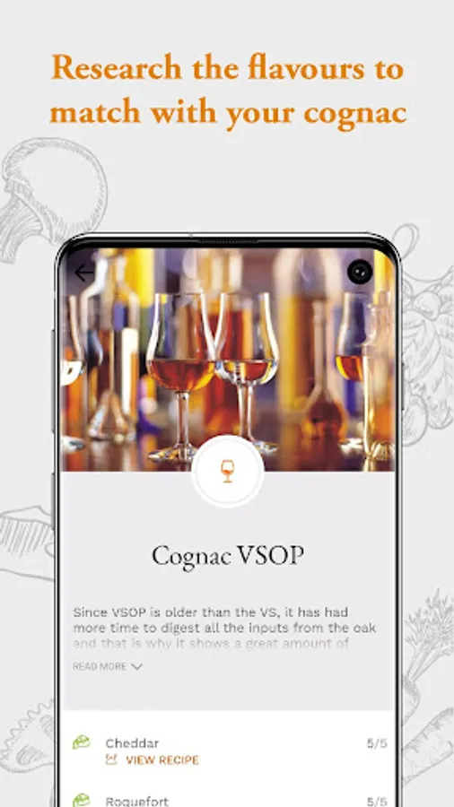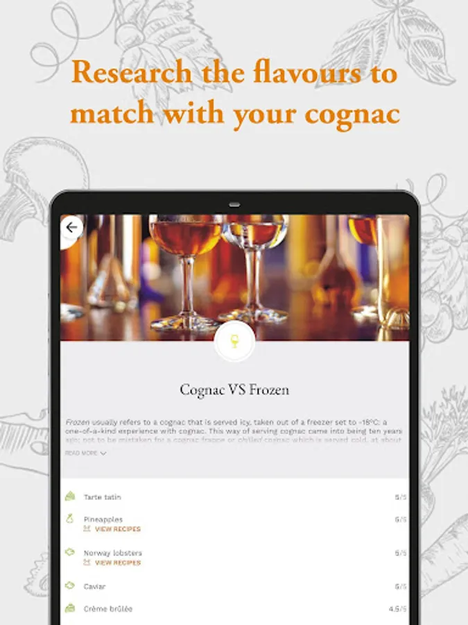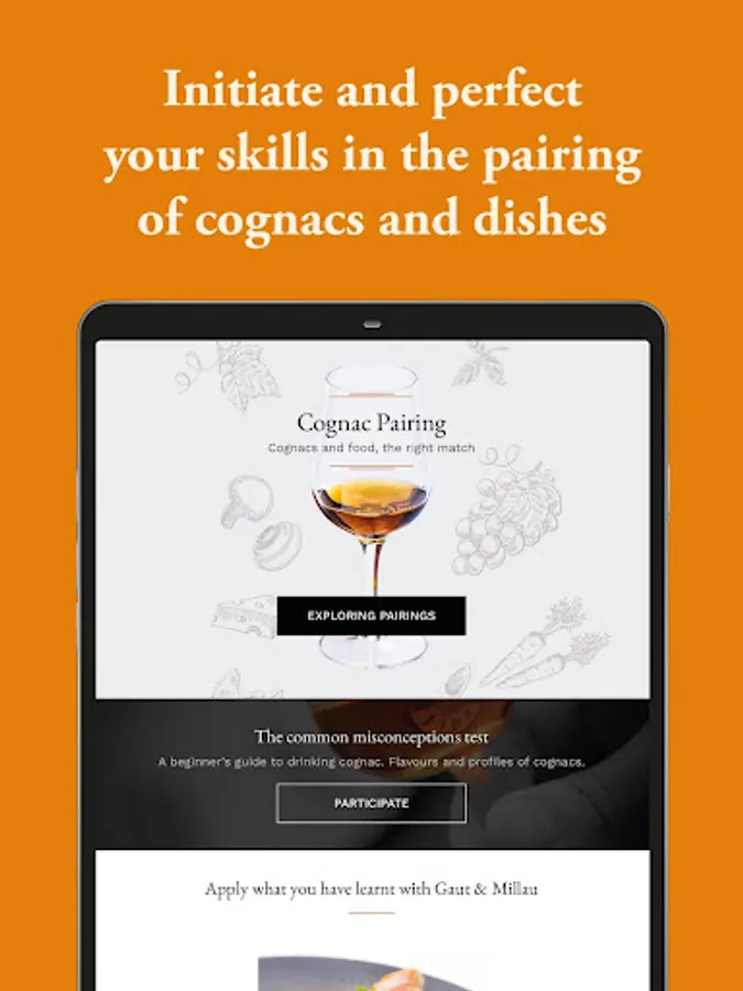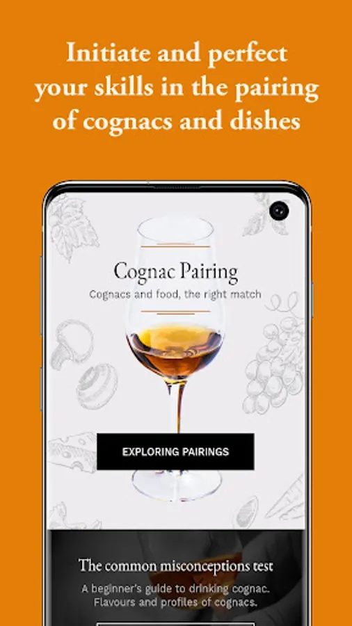 The "Cognac Pairing" app aims to initiate and improve your knowledge when it comes to cognac and food pairing and to help you discover this authentic spirit.