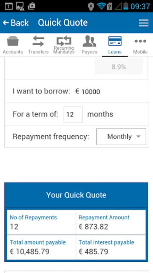 - Quick loan facility with live repayment estimations