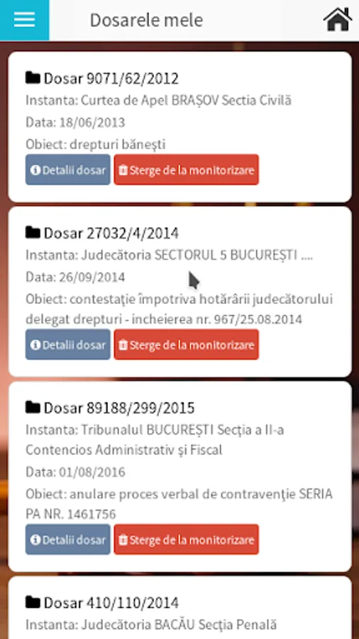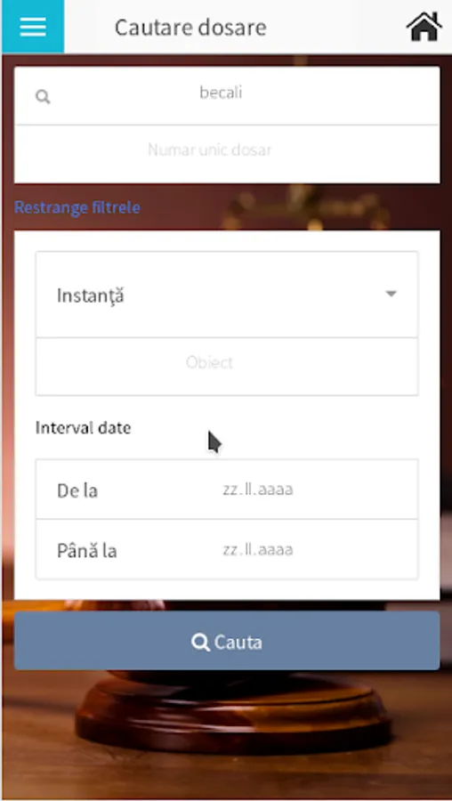 Files management application designed in court. Offers the following functionality: search portal court files by different criteria (file number, object, court, party file, etc ...), monitoring records.