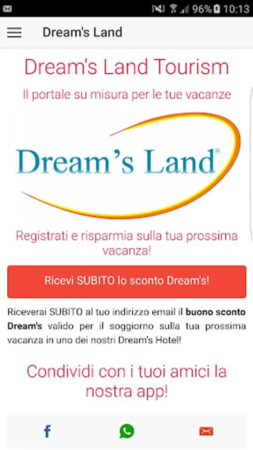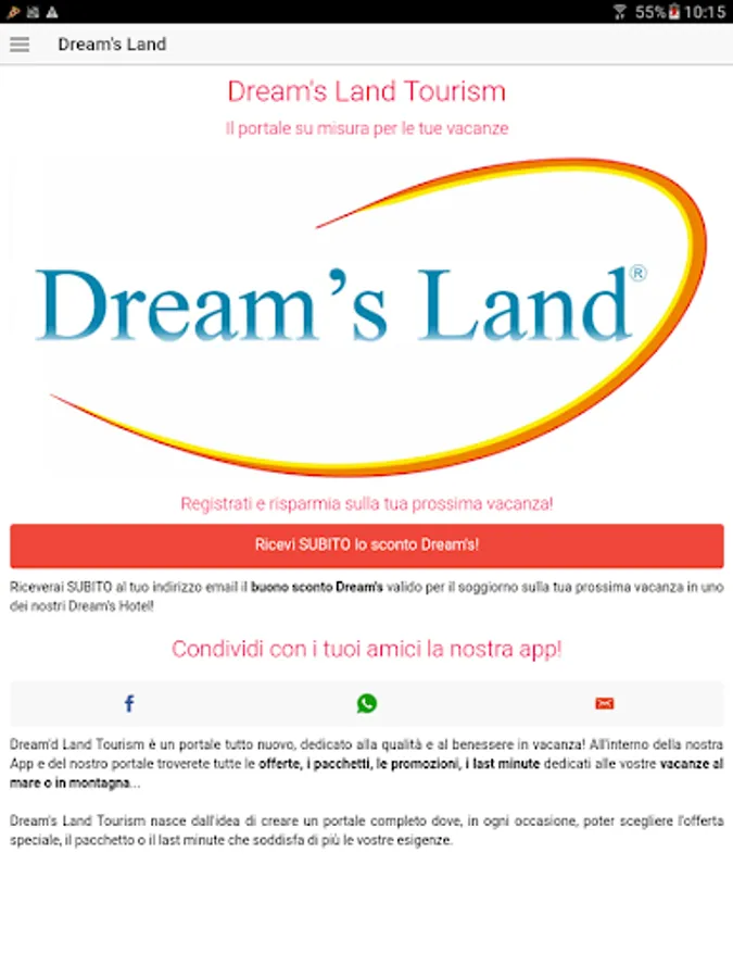 Dream's Land Tourism is an app dedicated to quality and well-being on vacation! Within our app and our portal you will find all offers, packages, promotions and last minute dedicated to your at the beach or in the mountains. Dream's Land Tourism is born from the ideal of creating a comprehensive portal where, on any occasion, to choose the special offer that best suits your needs. By joining our app will also receive a voucher, no additional costs for the stay in one of our Dream Hotel's affiliates.