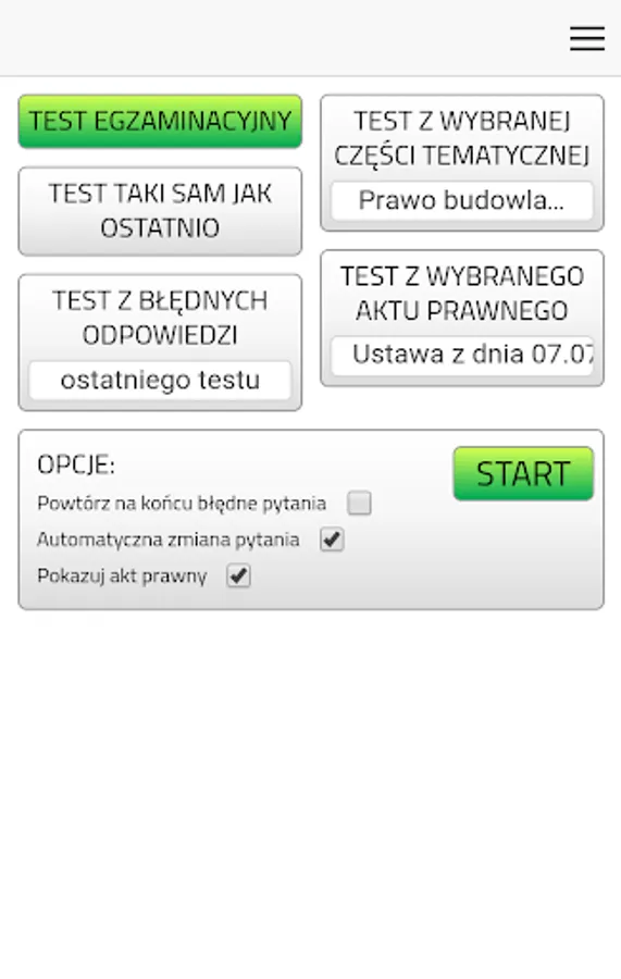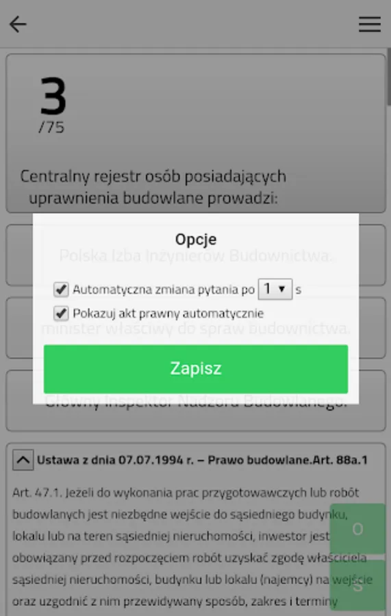 During the test, you can set the automatic change of the question after answering. The "show legal act" option allows you to automatically display the content of the legal act corresponding to the question under the answers.