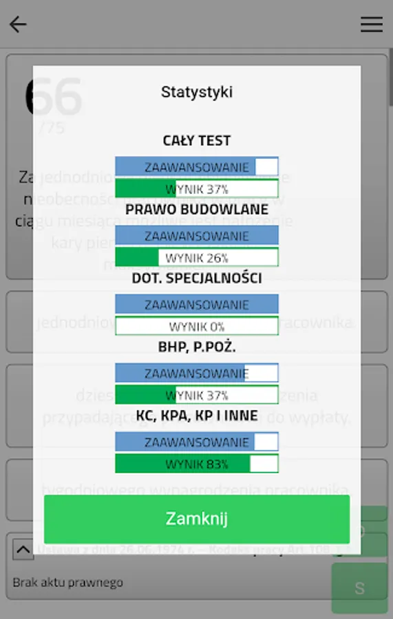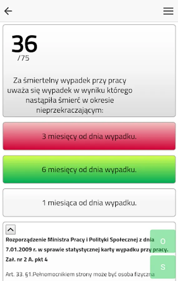 The application allows you to view the content of the legal act that the current question concerns. Now you can check where the correct answer comes from. This method allows for a better memorization of the question and allows greater freedom when answering a question about a similar subject. Questions on the exam may vary in details from those in the application, which may cause consternation when mechanically memorizing.