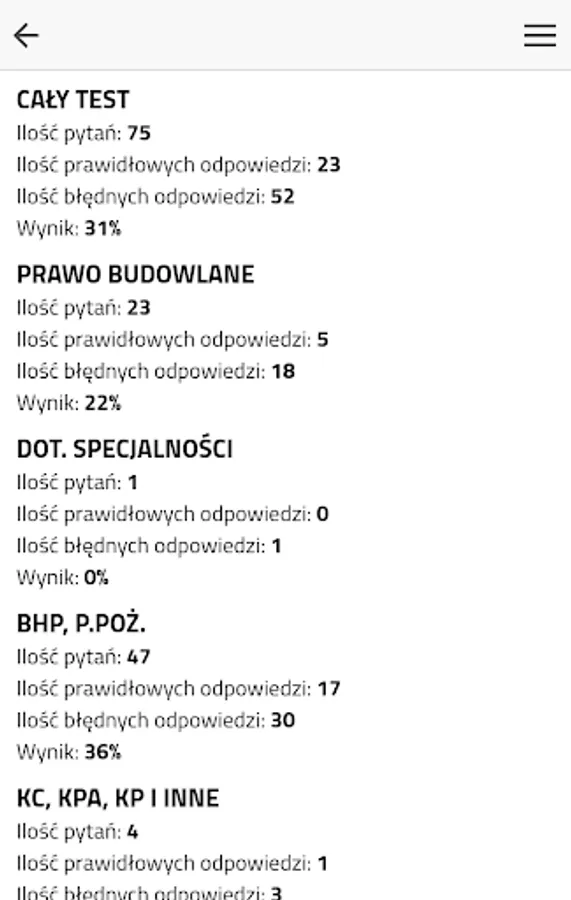 The application allows for a current preview of the percentage of test progress and result for each of the 7 thematic parts.