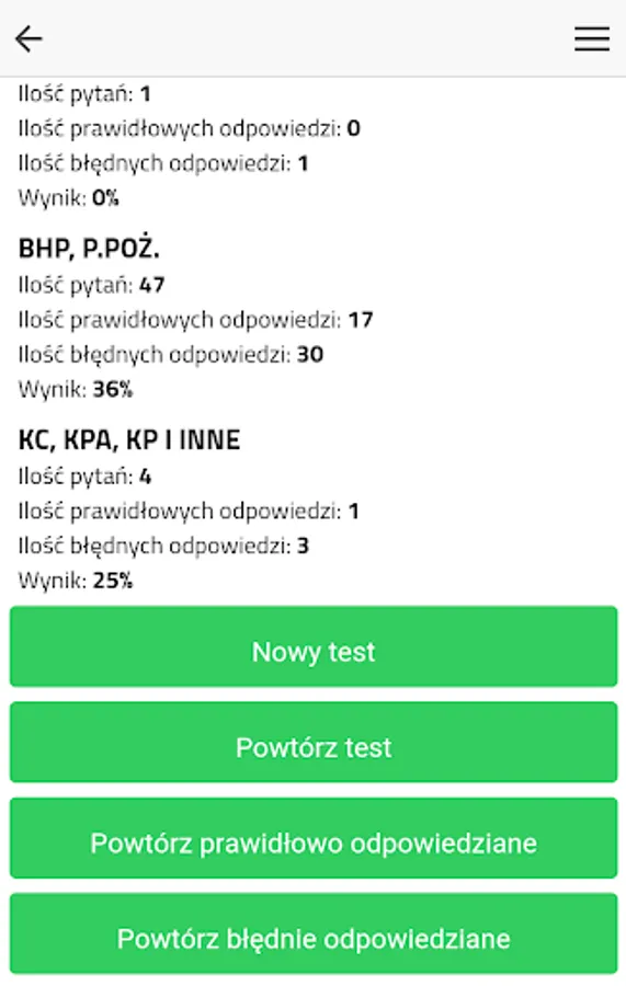 At the end of the test, the summary gives the opportunity to repeat incorrectly answered questions, correctly answered questions, a test of the same scope, the same test.