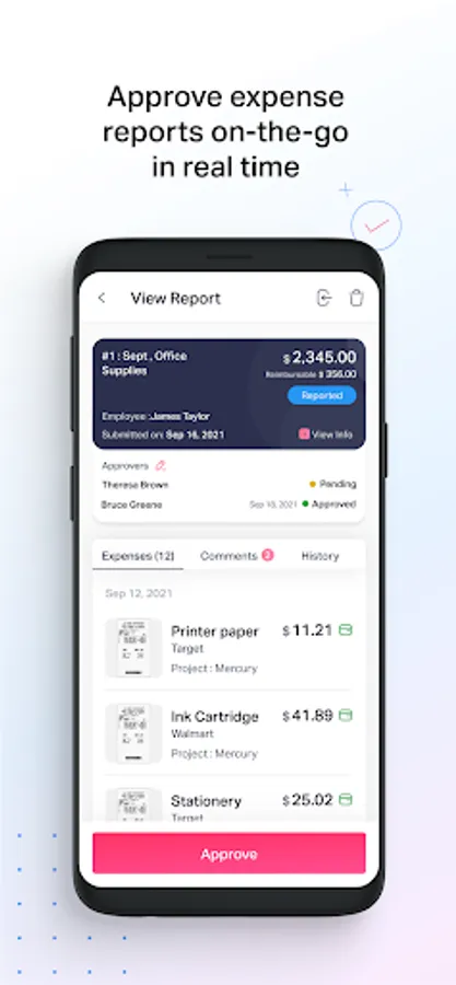 If you are a team manager or an admin, you can approve expense reports for your employees on the move or send them back to them with comments.