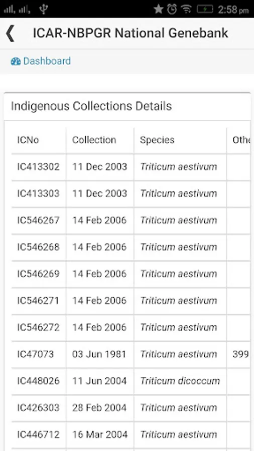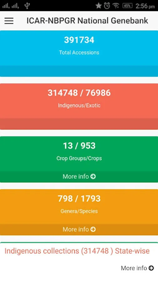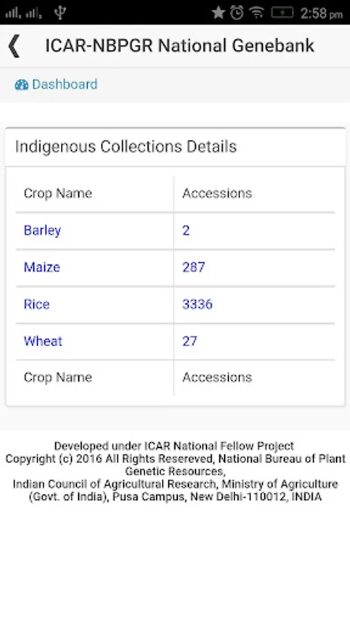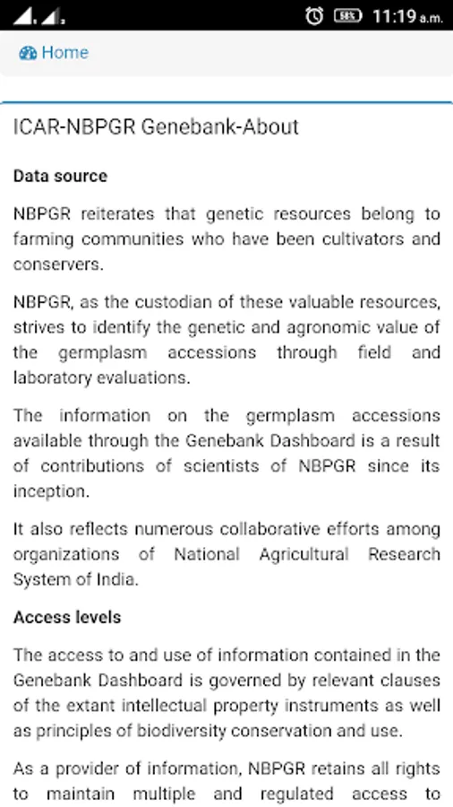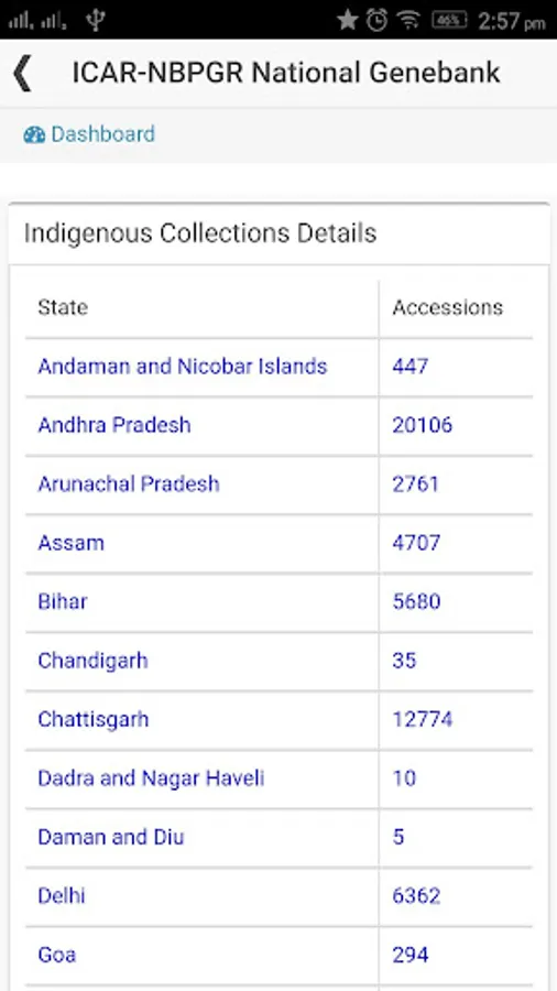 ICAR-NBPGR houses second largest genebank in the world. GENEBANK app gives a quick access to the information on germplasm accessions conserved. The app provides a personalized quick access to genebank information to PGR workers, breeders, students, research managers and administrators. The dashboard graphs are dynamically updated as and when genebank database is updated.