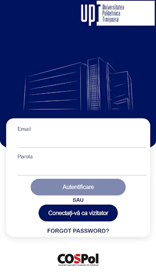 The authentication for students is done with the UPT student accounts (first name.name@student.upt.ro), received in Year 1. The password can be reset by accessing the following link https://password.upt.ro/pwm/public/ForgottenPassword.