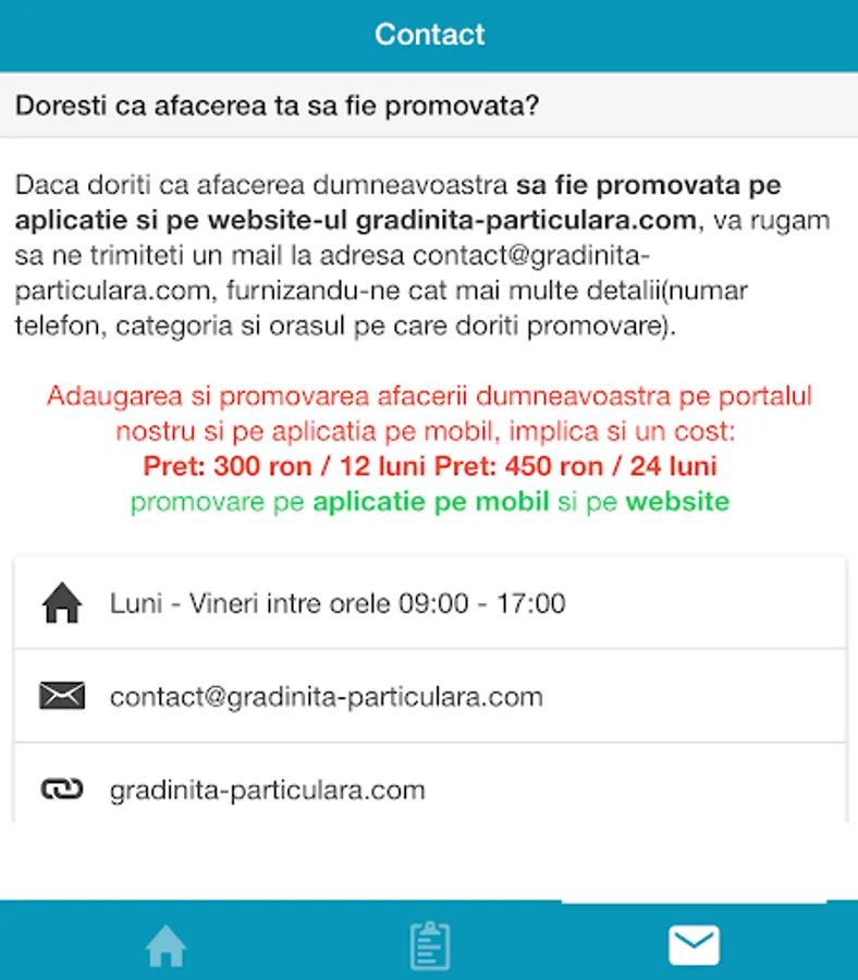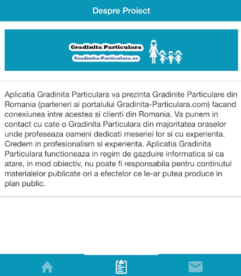 The application presents gardens for private kindergartens in Romania (Gradinita-Particulara.com portal partners) making the connection between them and clients in Romania. We in contact with one private gardens in most cities where dedicated people practicing their skills and experience.