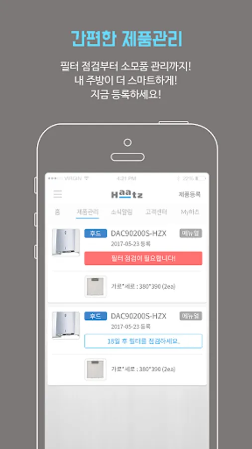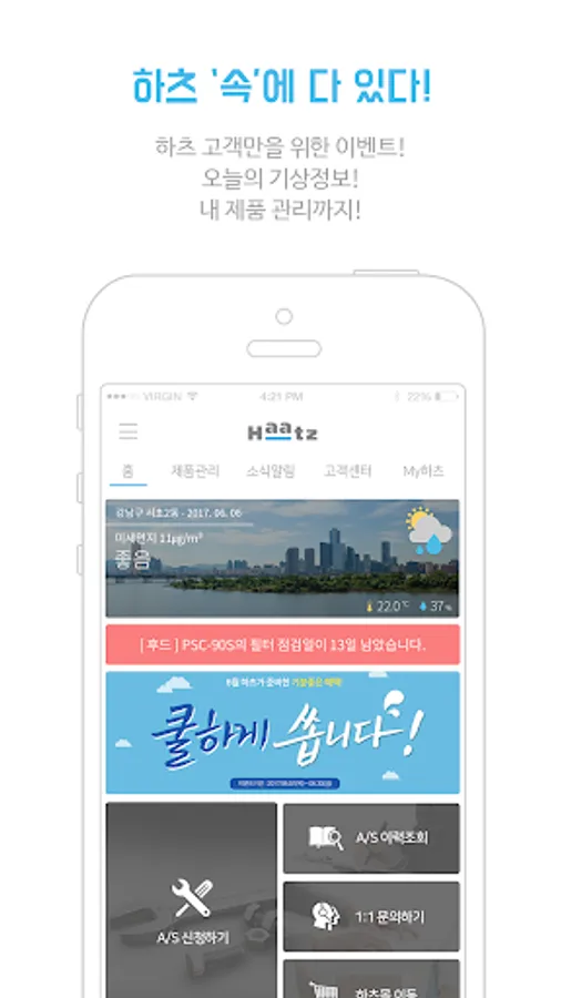 You can use the product management services such as regular maintenance and filter replacement of the Hartz products, at the same time, you can easily access to the A / S application of the product.