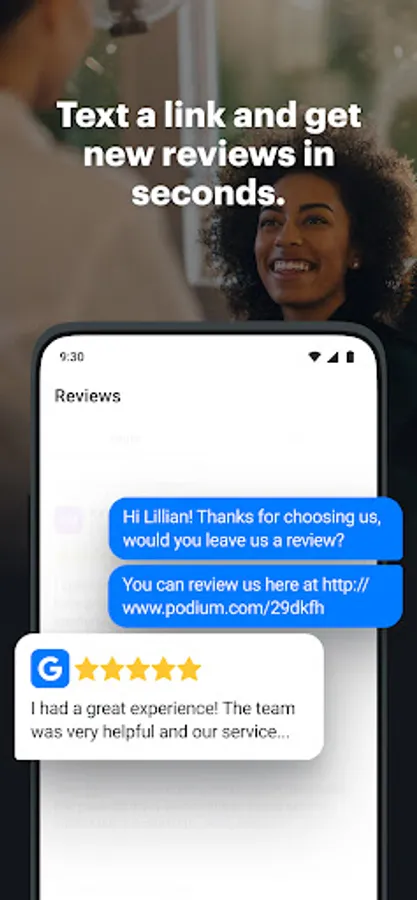 - Reviews: Double your monthly review volume in less than 60 days and increase website and foot traffic to your business by sending review invitations via text through Podium.