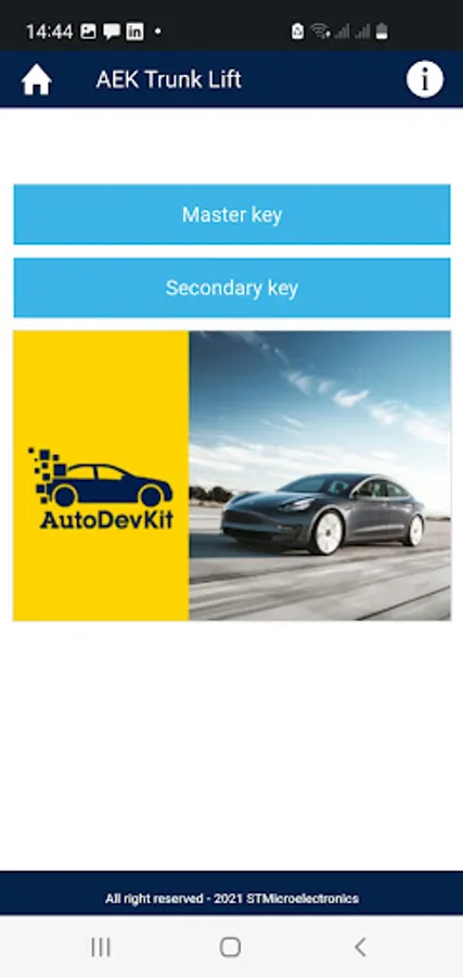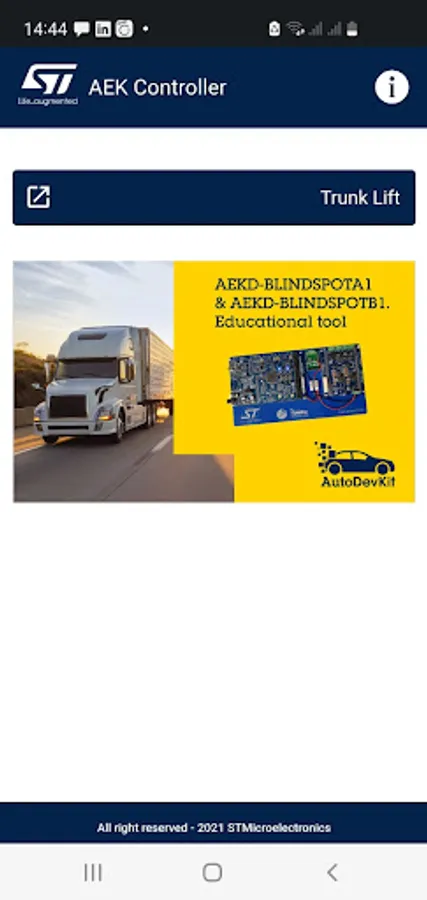 The AEK Controller is the easiest way to control Automotive Application Demonstrators created inside AutoDevKit Ecosystem. With your Android device, you can send commands to all the MCU discovery and functional boards, connected together to develop automotive applications (Motor Control, Communications, AVAS, Adaptive Front Lighting, Blindspot detection and many more…)