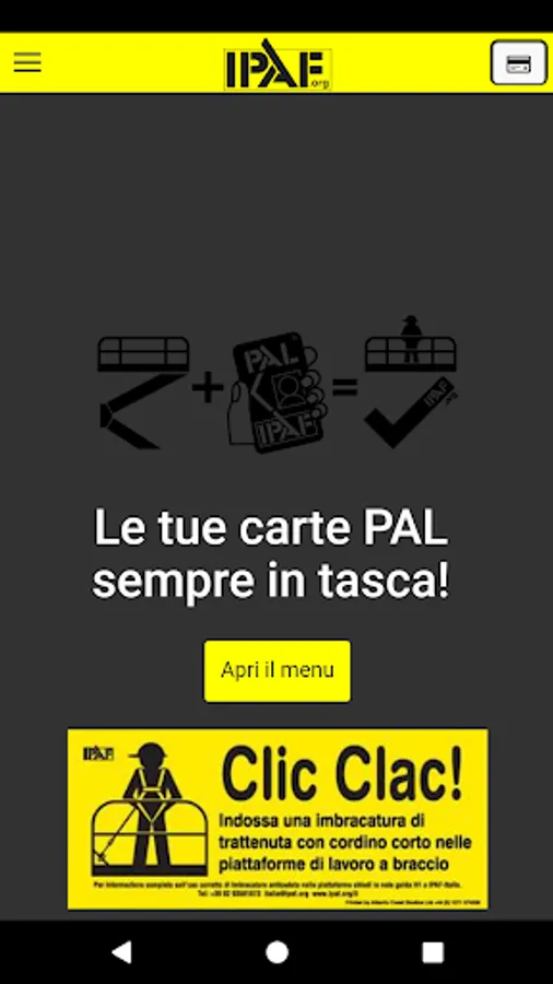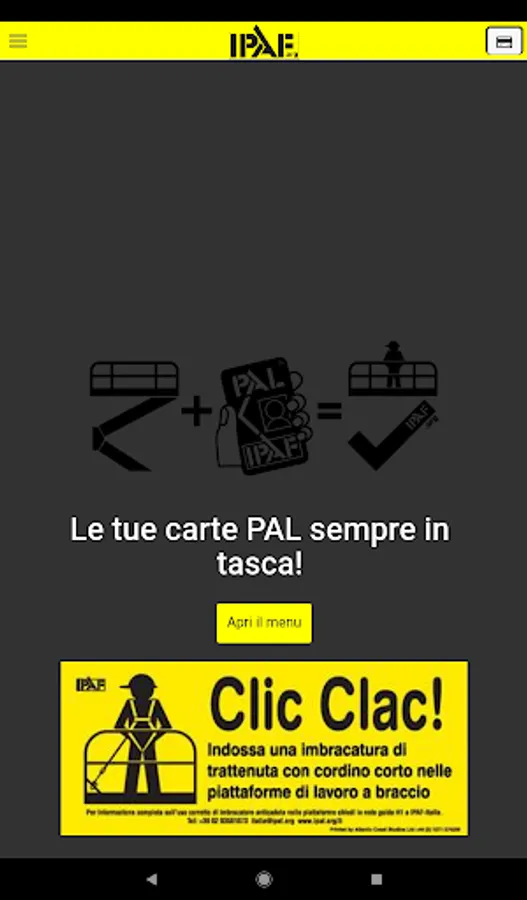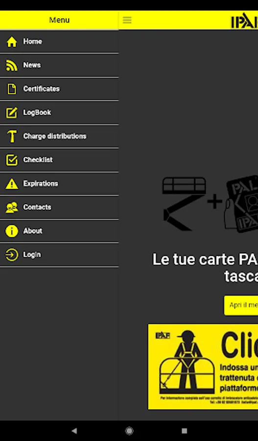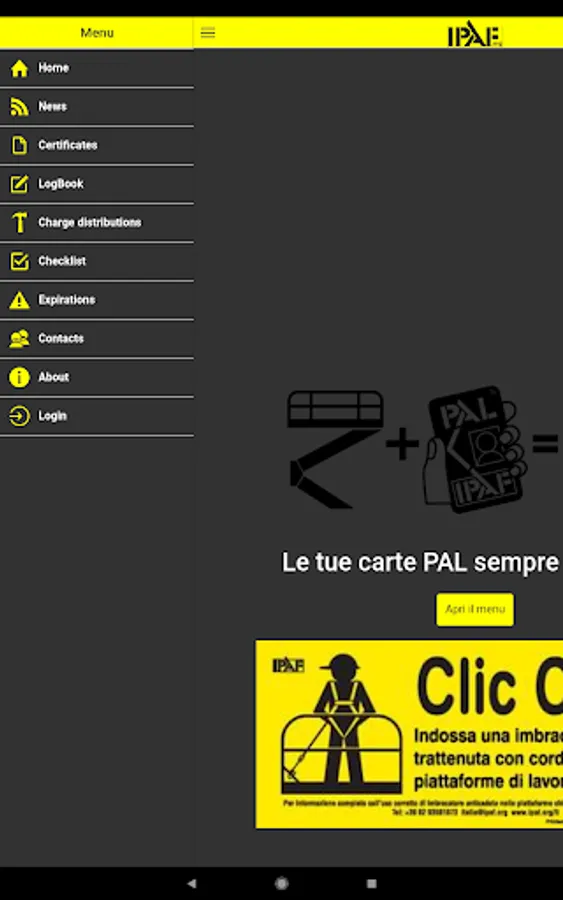 The APP IPAF for Italian holders of the PAL Card operator to PLE provides some useful services: the attestation of IPAF training to the Association's news, from your Logbook to the conversion of the base plates table, the check-list to own timetable.