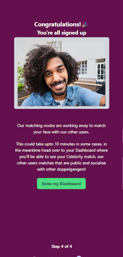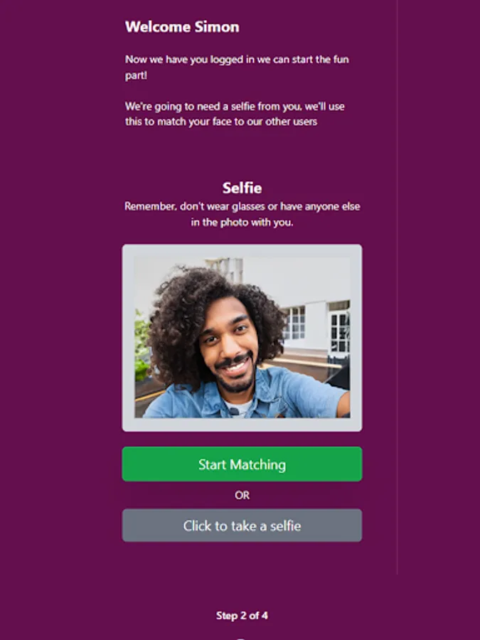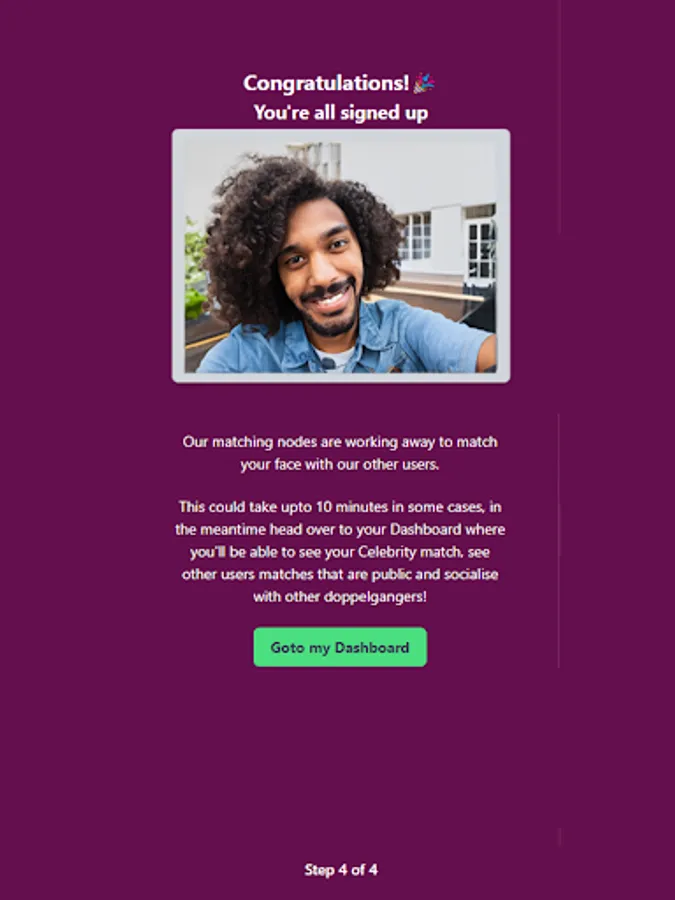 We use the latest facial recognition to match your photo with other users who have also joined up to Doppelgangers. It's totally free, no hidden catches, simply sign up with your name, email and password and take a selfie. Our facial recognition packages will scan your face and match you to other users.