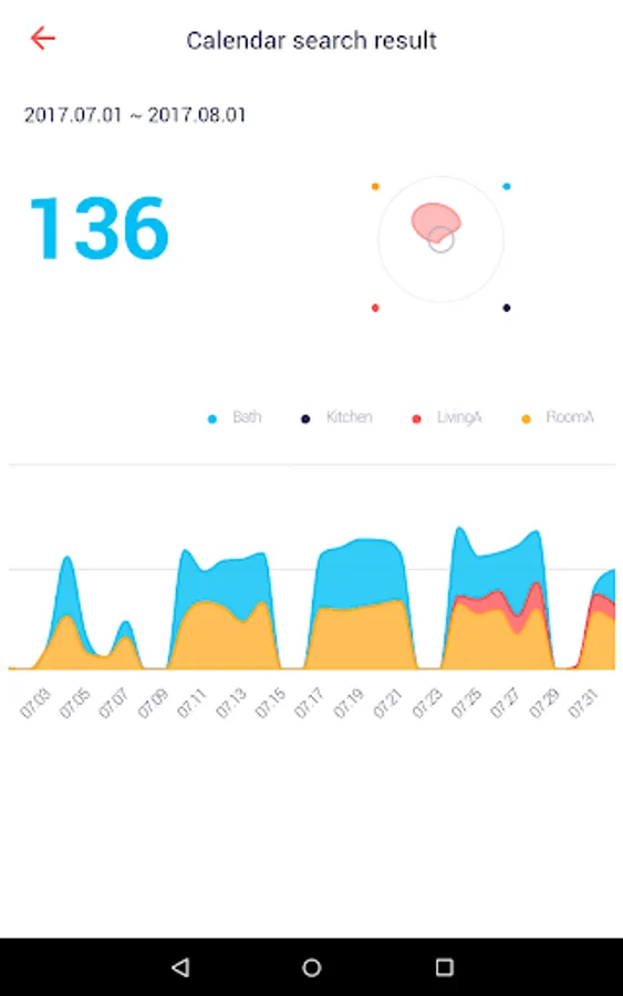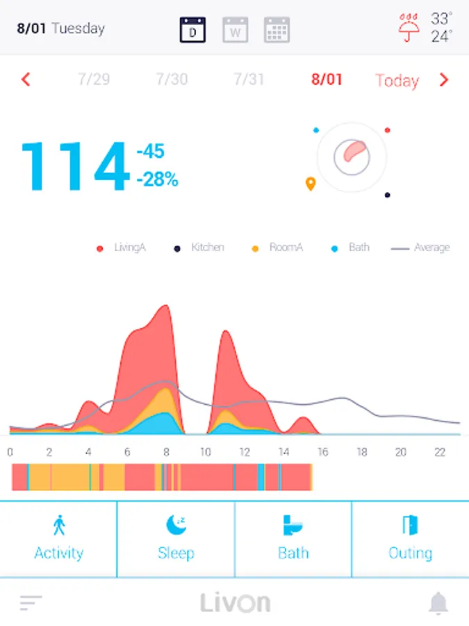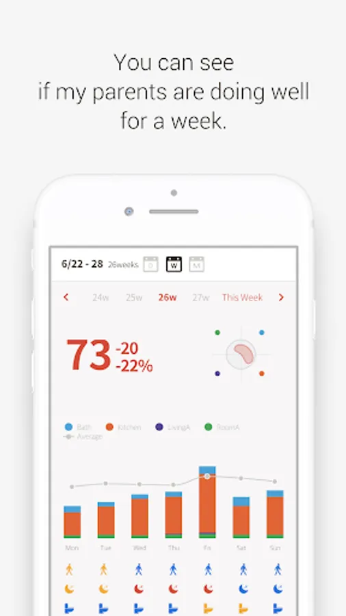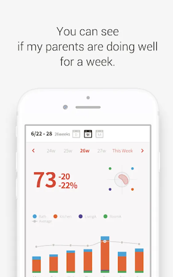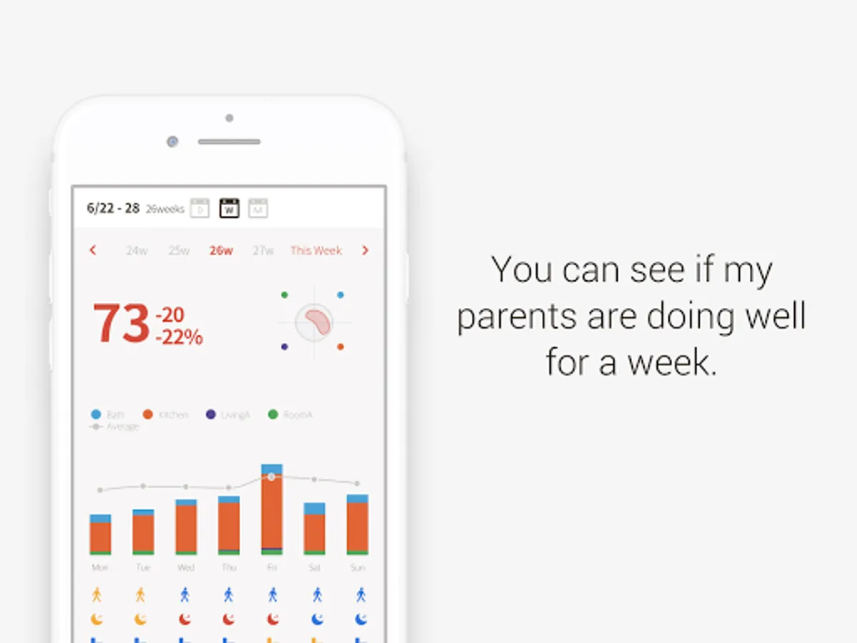 It provides daily, weekly and monthly reports on changes of activities at home, and the status of the user compared to the big data of the same aged users collected over the years.