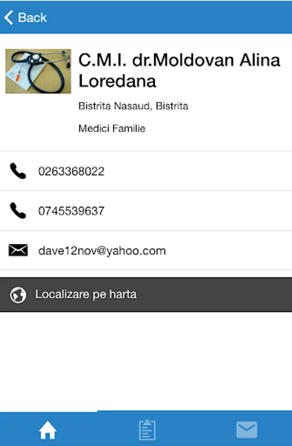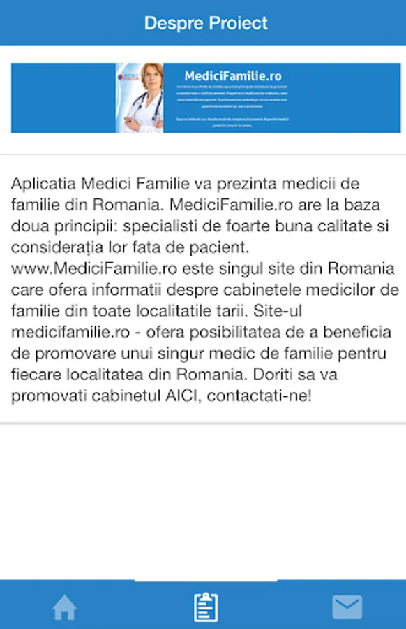 The application presents Family Physicians Family Physicians of Romania. MediciFamilie.ro is based on two principles: high quality specialists and their consideration for the patient. blood is from Romania www.MediciFamilie.ro site that provides information about family physicians' offices in all cities of the country. Medicifamilie.ro site - offers the opportunity to benefit from the promotion of one GP for every locality in Romania. Want to promote your office here, contact us!