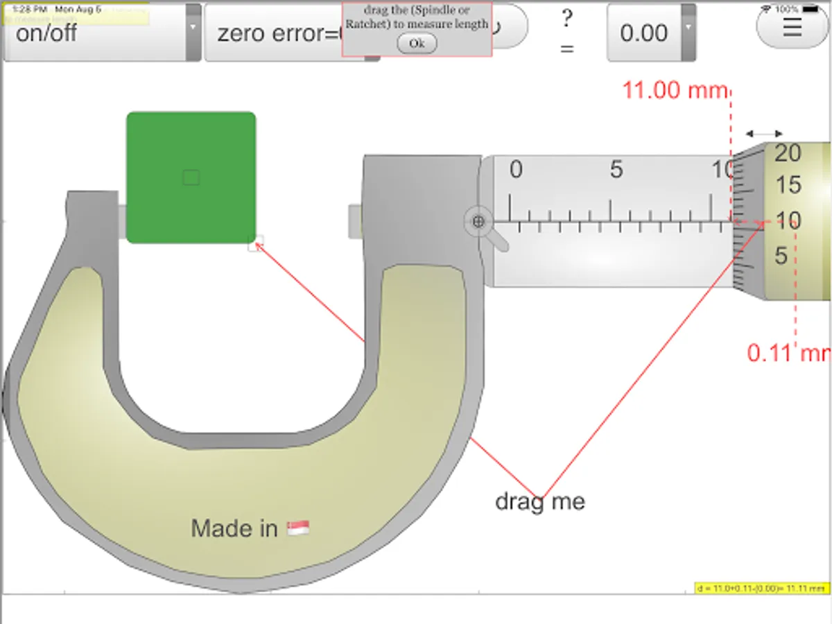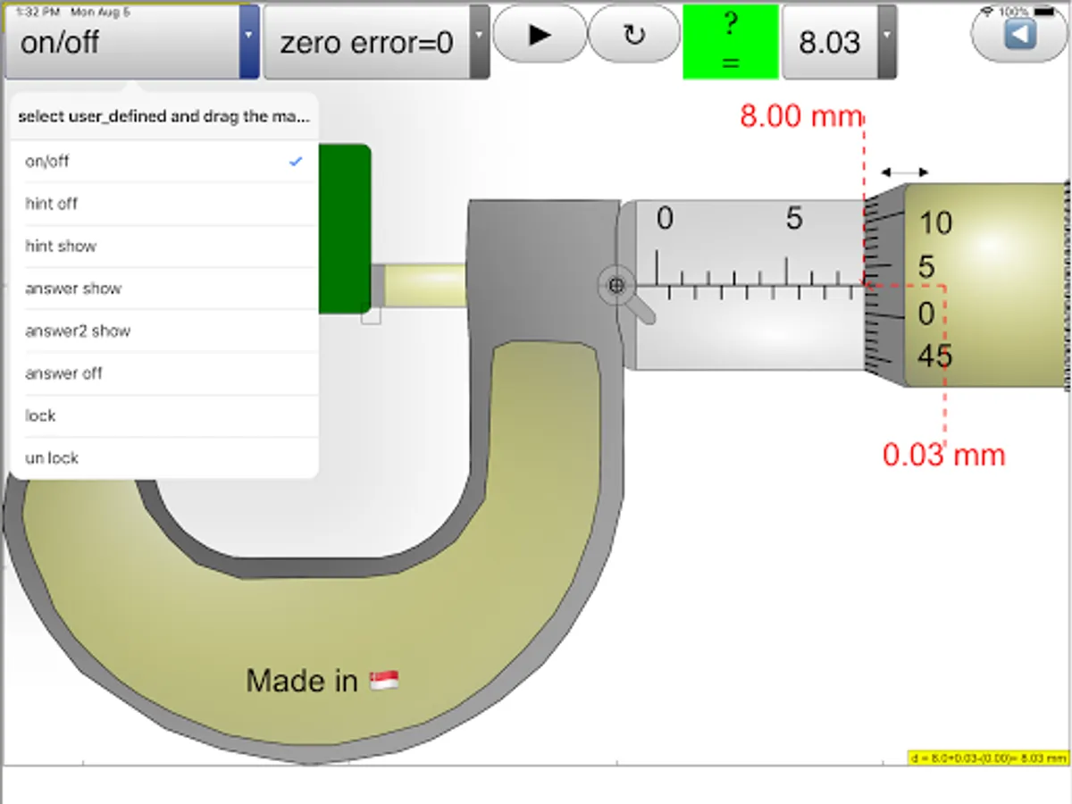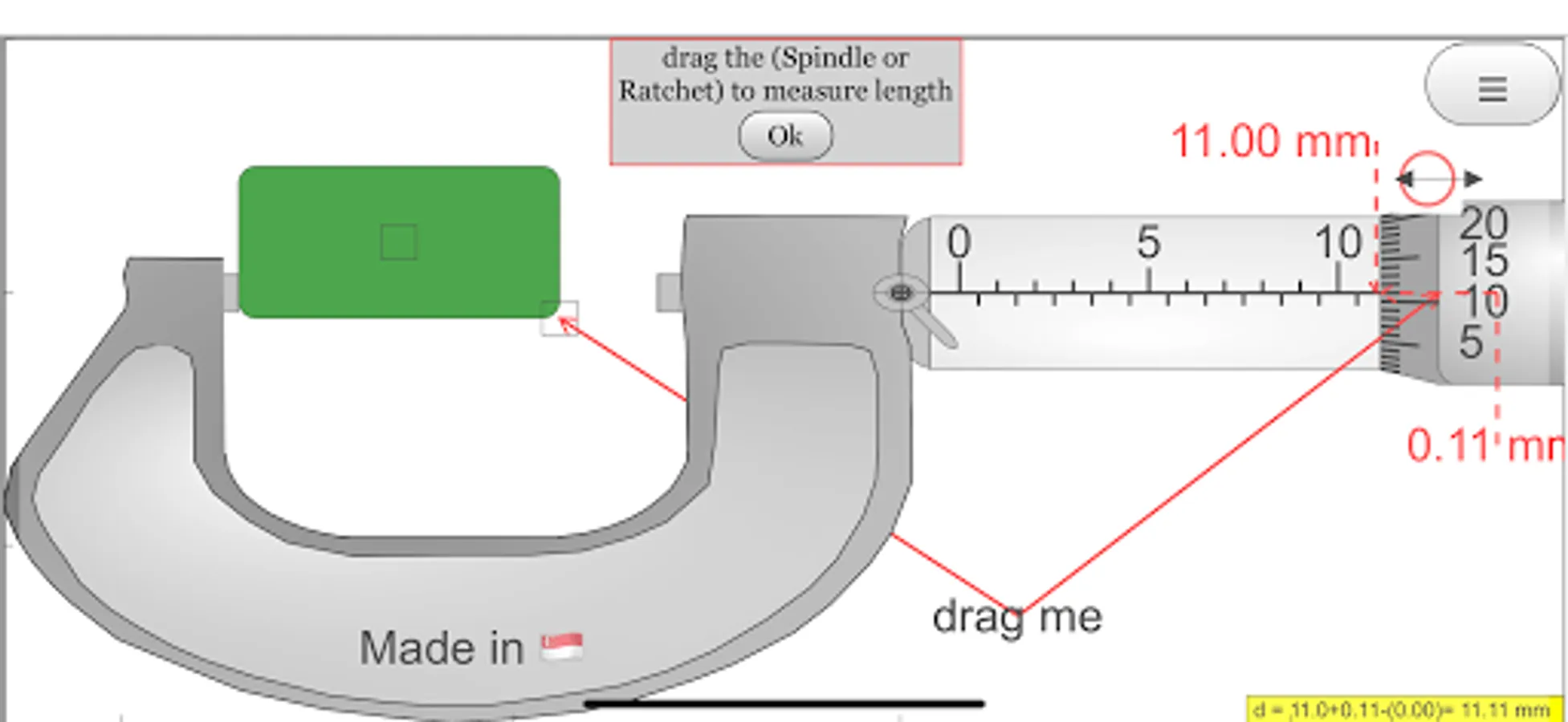 There are checkboxes: hint: guidelines and arrows to indicate the region of interest plus the accompanying rationale for the answer. answer: shows the measurement d = ??? mm lock: allows simulating of the lock function in real micrometer which disable changes to the position of the spindle then by the measurement is unchangeable. On the bottom, there is a green slider to control the position of the spindle, drag on any part of the view also drags the spindle.