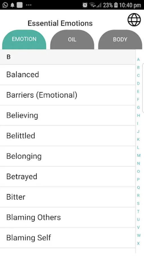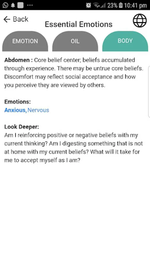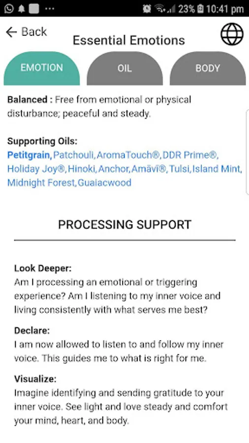 The Essential Emotions app lets you look up specific oils, emotions, or body concerns, then leads you through processing support to get to the root of your concern. Identify the negative emotion you are currently feeling or choose a positive one you want to feel from 500+ emotions, 100+ essential oils or 250+ body parts and systems. Apply the recommended essential oil, then reprogram thinking and behavior patterns by using questions to look deeper, declarations and visualization prompts.