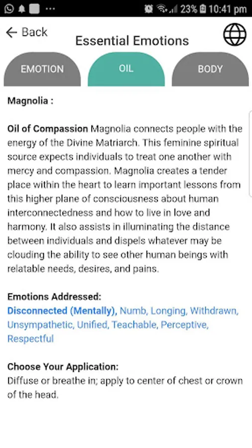 The Essential Emotions app is your complete on-the-go guide to emotions and essential oils. Find everything you need to unlock the emotional power of your essential oils. Learn the emotional properties of each doTERRA essential oil and be guided through oil selection, application and processing. Now, with new content from the former Emotions and Essential Oils (now Essential Emotions) book, go from knowledge to application in a few clicks.