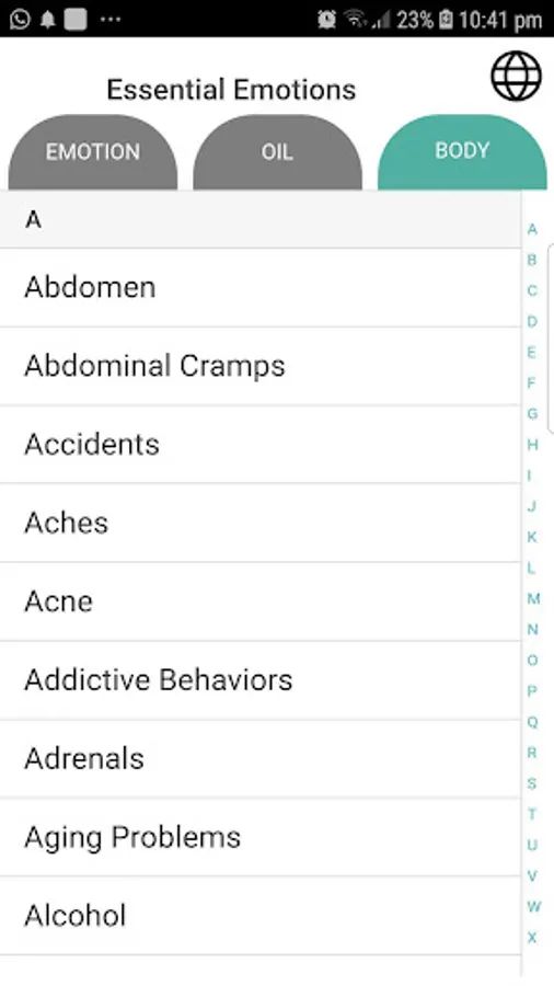 Body Tab with 250+ body parts and conditions that link to underlying emotional roots