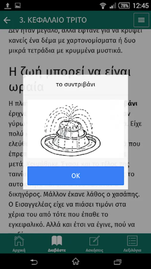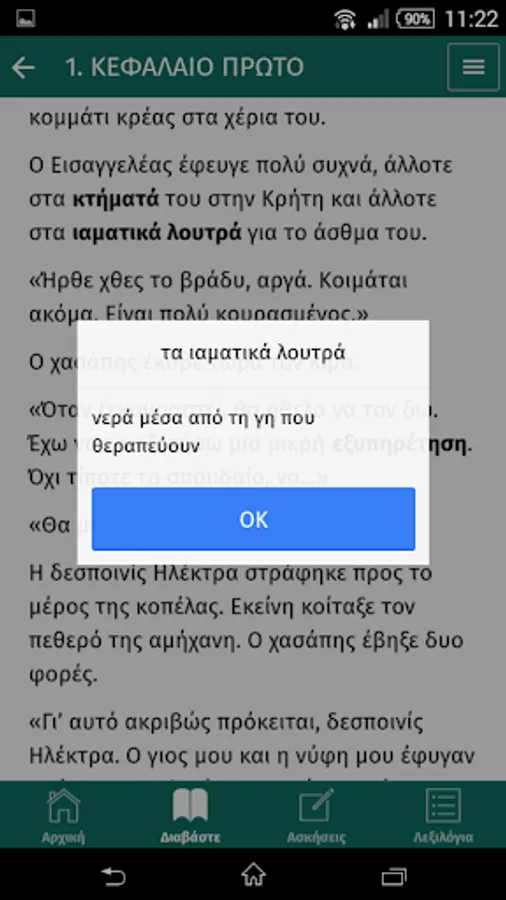 You will see the titles of the chapters so that you can get an idea of the story. As you read through, you will find words or phrases in bold letters. By clicking on each word or phrase its meaning in simple Greek or a sketch will pop up (open) in a new window. The translation of the same items can also be found in the Λεξιλόγια (Vocabularies) section.