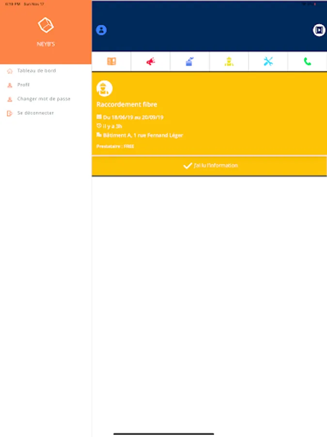 En lien avec votre bailleur, l'application NEYBS vous permet d'être informé en temps réel de votre vie de quartier : une panne d'ascenseur, des travaux à venir, une concertation sur l'avenir de la résidence...