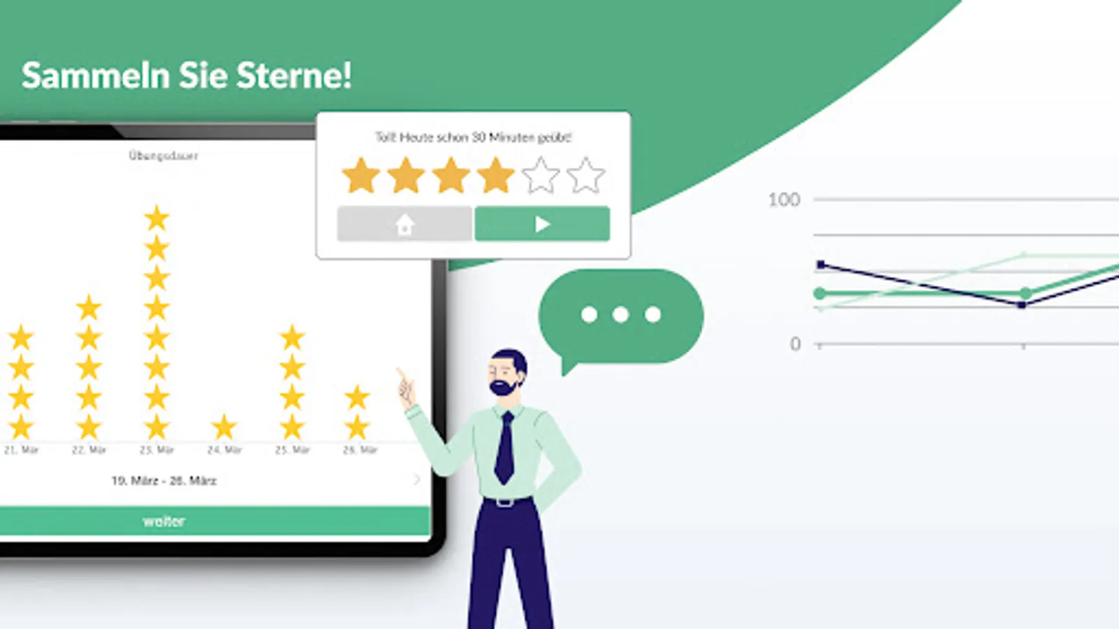 The app automatically documents your progress and displays it in clear graphics. Your therapist accompanies the self-training and can constantly adapt it to your learning progress. You always train at your personal performance limit and are never under- or over-challenged. The app also contains motivating feedback in the form of stars, which are worked out every 10 minutes and are displayed in a weekly overview.