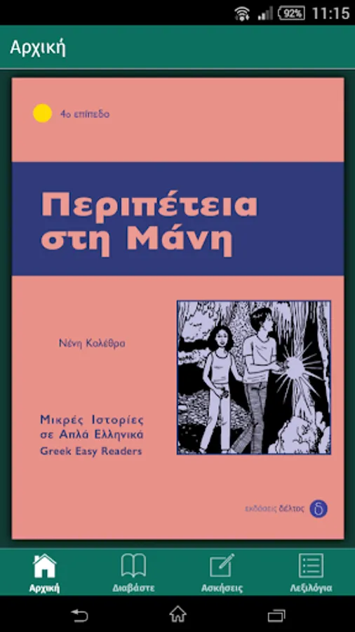 Τhe Greek Easy Reader Apps are language learning apps based on short stories accompanied by related exercises, which aim at improving the learner’s reading comprehension skills and building up their vocabulary. All stories are authored by experienced Greek language teachers. The narratives are original detective stories or adventure tales, which may be read and further exploited by the learner with or without the help of a teacher or dictionary. The series consists of 10 titles in 5 learning stages.