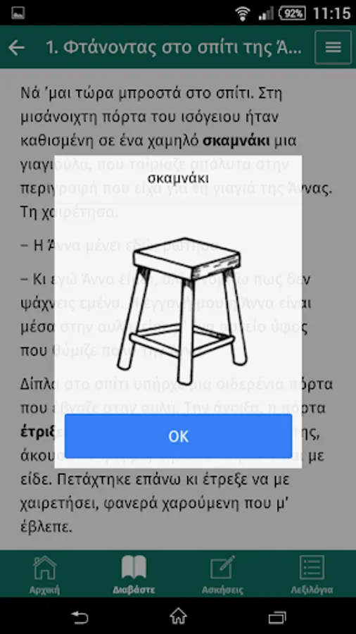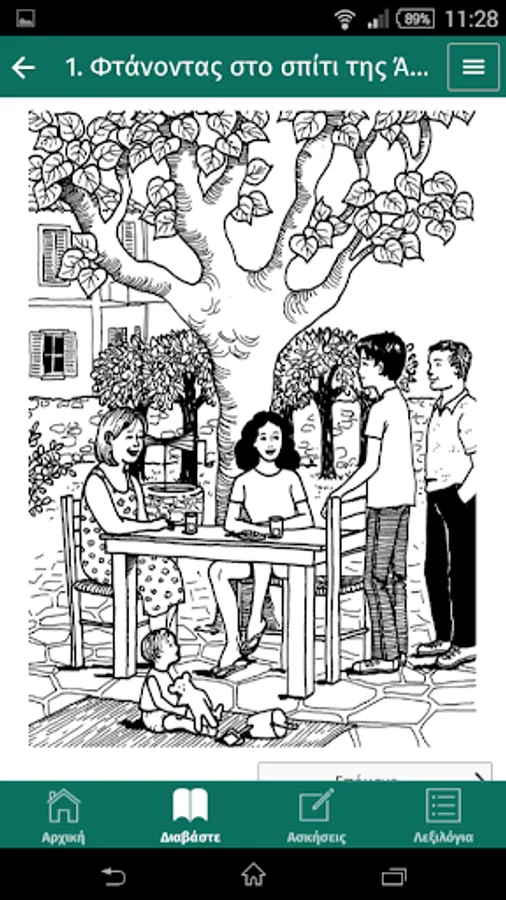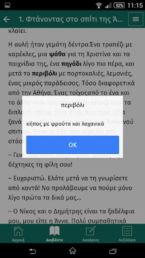 You will see the titles of the chapters so that you can get an idea of the story. As you read through, you will find words or phrases in bold letters. By clicking on each word or phrase its meaning in simple Greek or a sketch will pop up (open) in a new window. The translation of the same items can also be found in the Λεξιλόγια (Vocabularies) section.