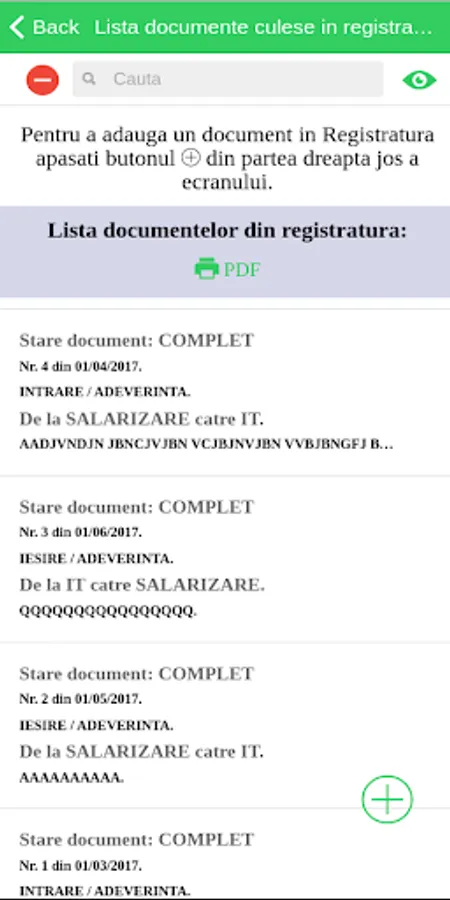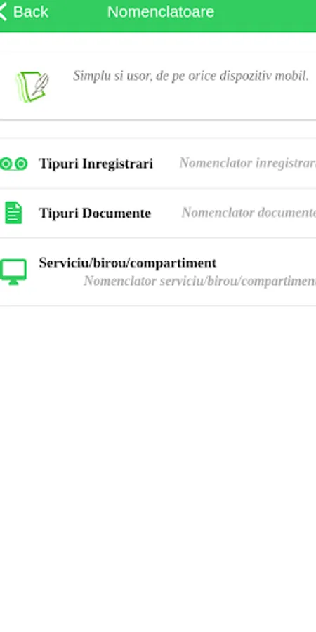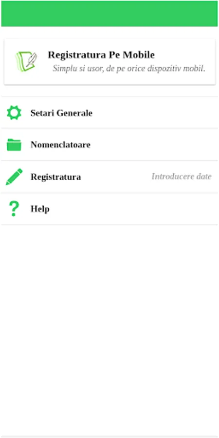 Aplicatia "Registratura pe Mobile" este o aplicatie destinata telefoanelor si tabletelor Android. Programul ofera posibilitatea inregistrarii intrarilor si iesirilor de documente dintr-o firma, direct de pe telefonul mobil/tableta, avand posibilitatea crearii de rapoarte in format PDF.