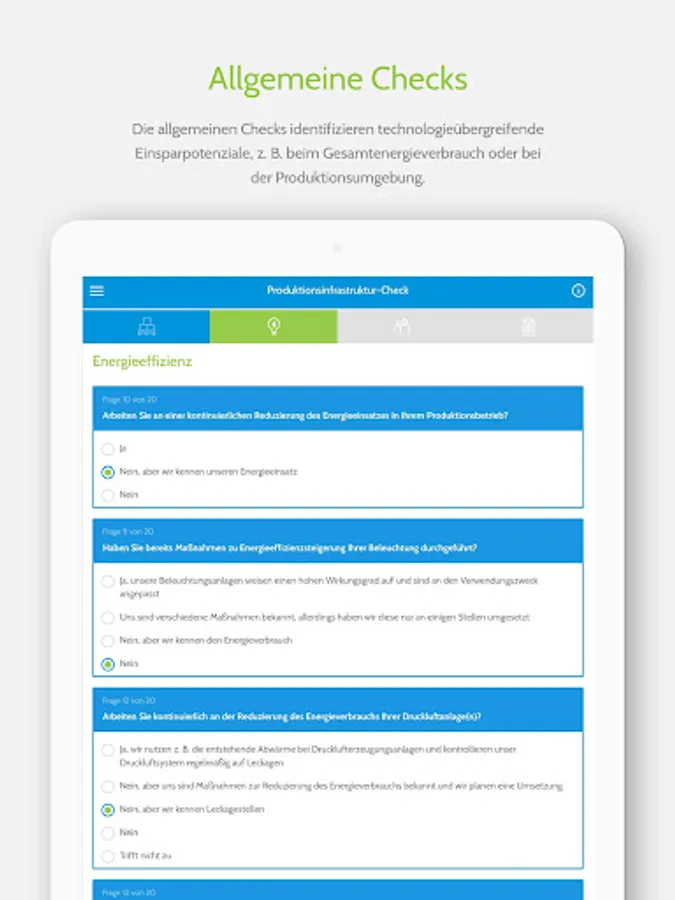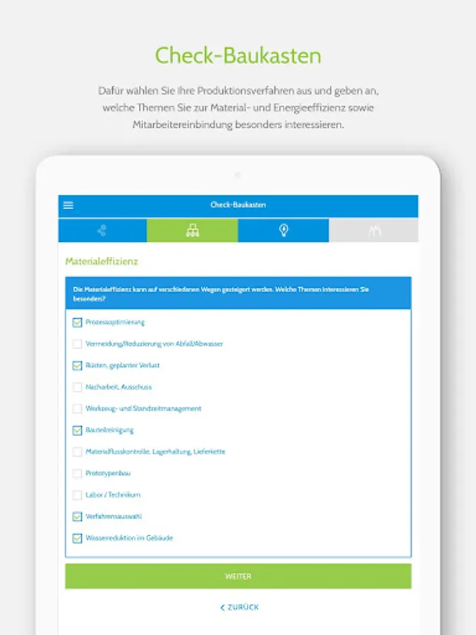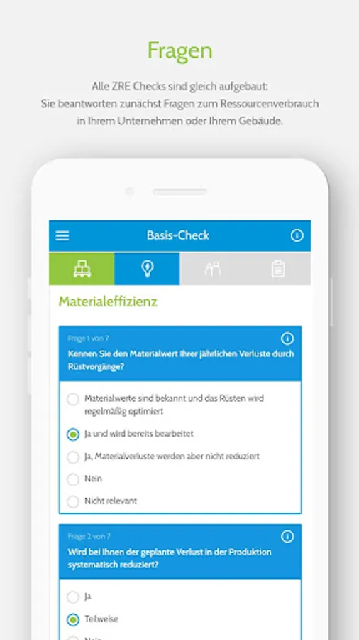 We have prepared various resource checks for you with questions about the overarching topics of material efficiency, energy efficiency and employee involvement, which will help you to get an initial overview of possible savings potential in your company or building.