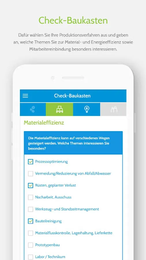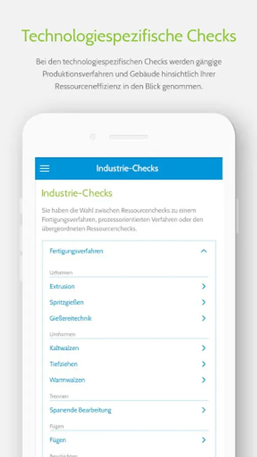 3. Industry Checks: Here you will find resource checks with selected questions about common manufacturing processes, such as: Casting, thermoforming or joining, as well as process-oriented processes in the chemical industry.