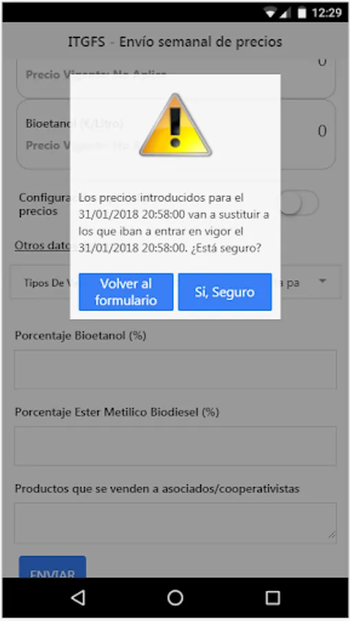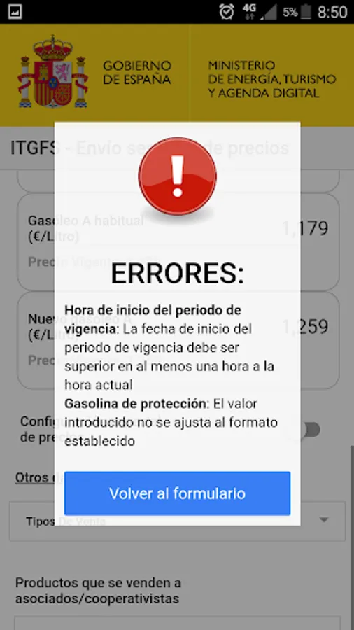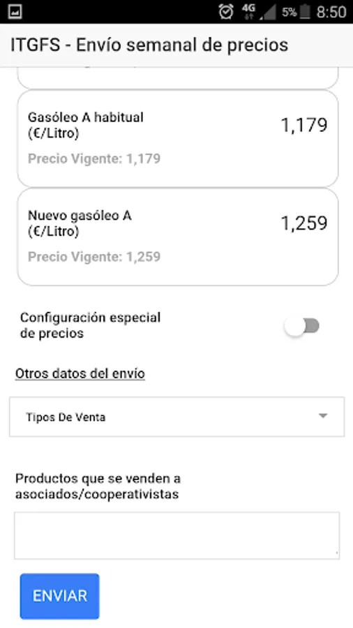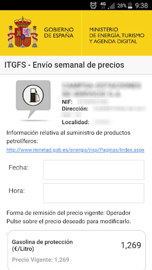 Application that allows the sending of information about the activities of supply of petroleum products to the Ministry for the Ecological Transition. In this first version, only ITGFS (General Terrestrial Frequency Weekly Facilities) will be available for service stations. Shipping is mandatory as long as prices change and Mondays (even if they do not change).