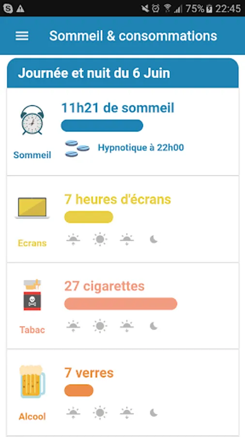 Designed as a diary tracking of sleep and behaviors (smoking, alcohol or other drugs but also games, food displays or behavior) it offers users to know themselves better and to facilitate their monitoring with sleep medicine professionals and addiction.