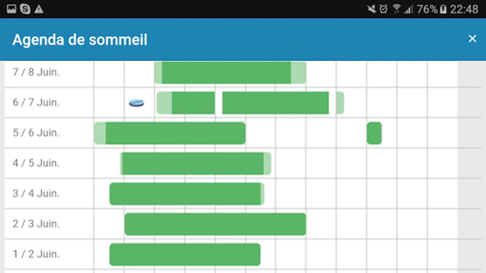 Used in sleep medicine, calendar allows you to view in a glance the structure of your sleep (sleep = dark green, light green = time in bed without sleeping).